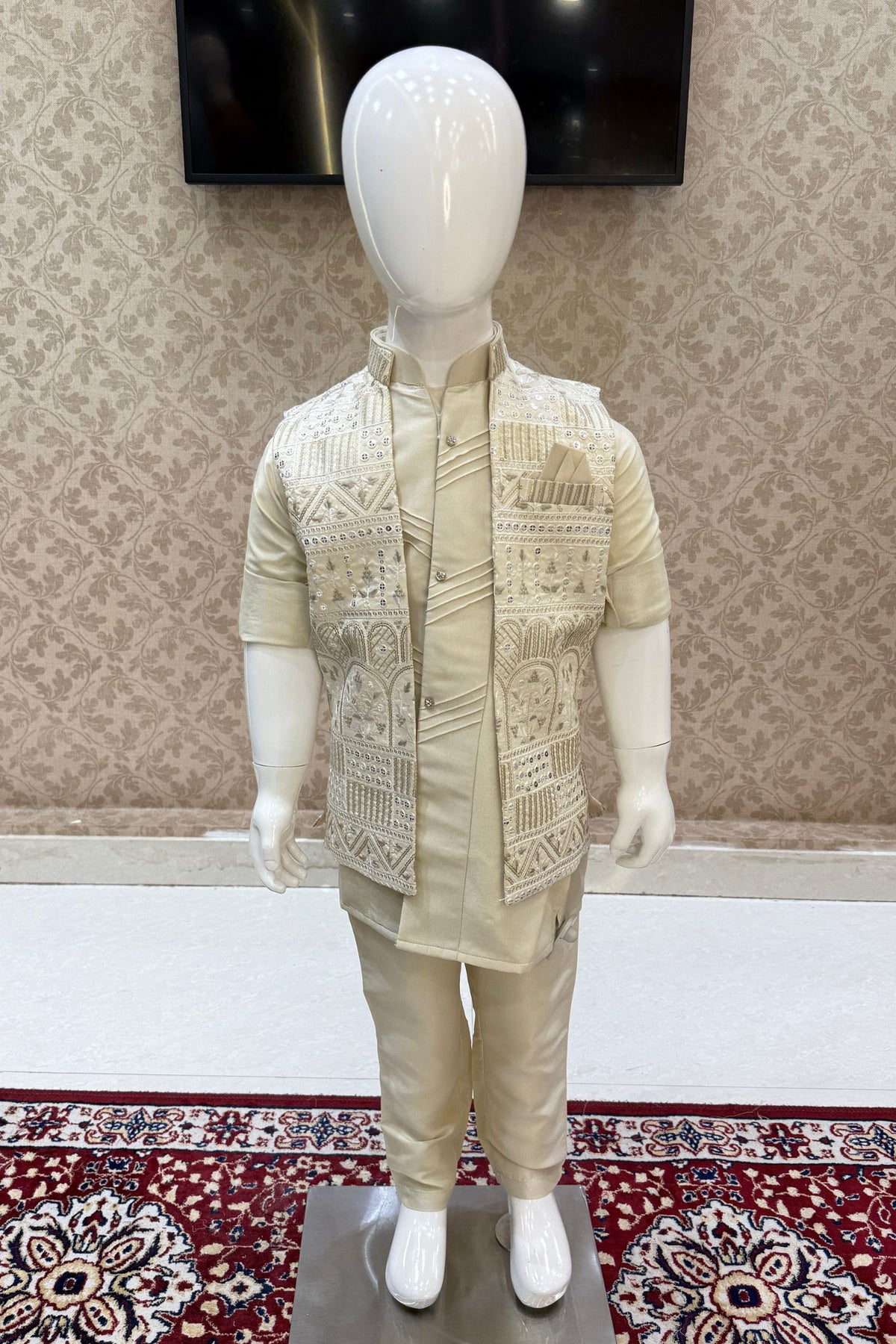 Beige Thread and Sequins work Waist Coat Kurta Set for Boys