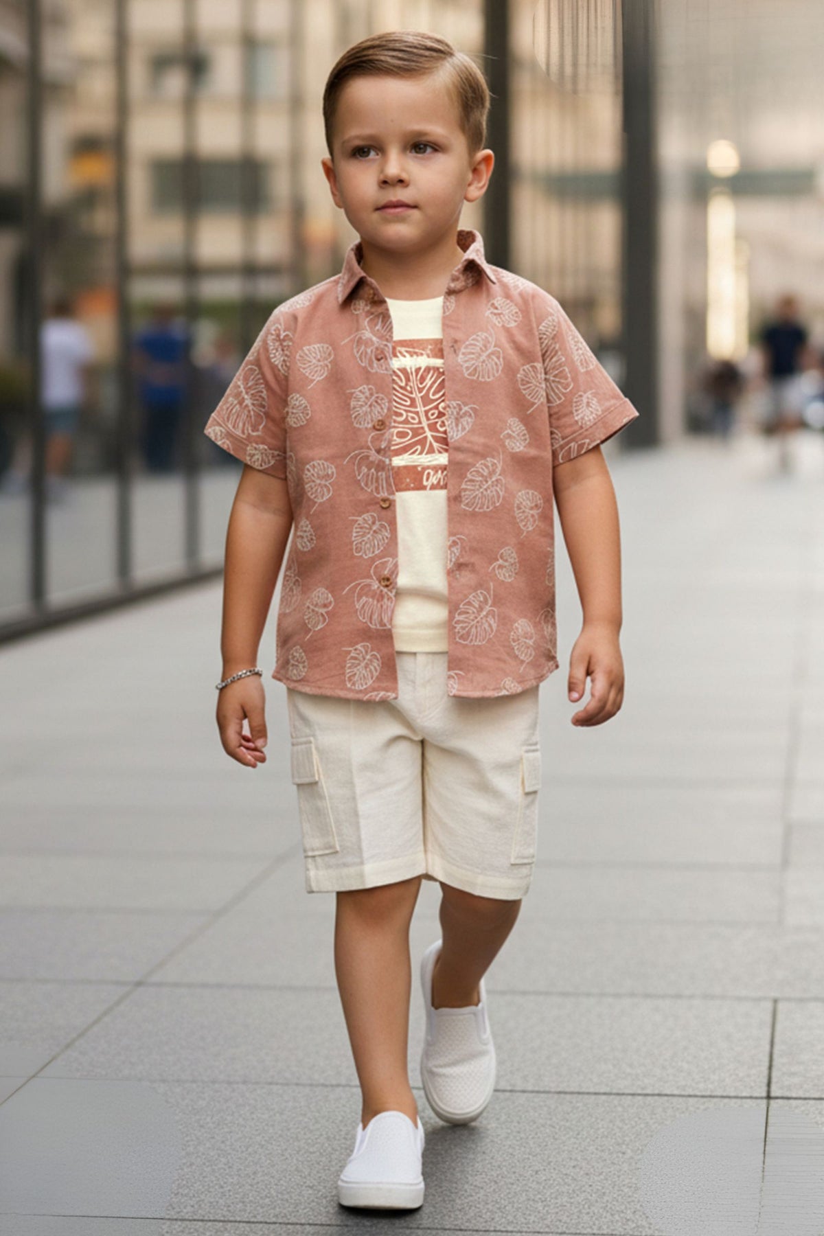 Cream with Dusty Rose Blazer, Printed T-Shirt and Shorts Set for Boys