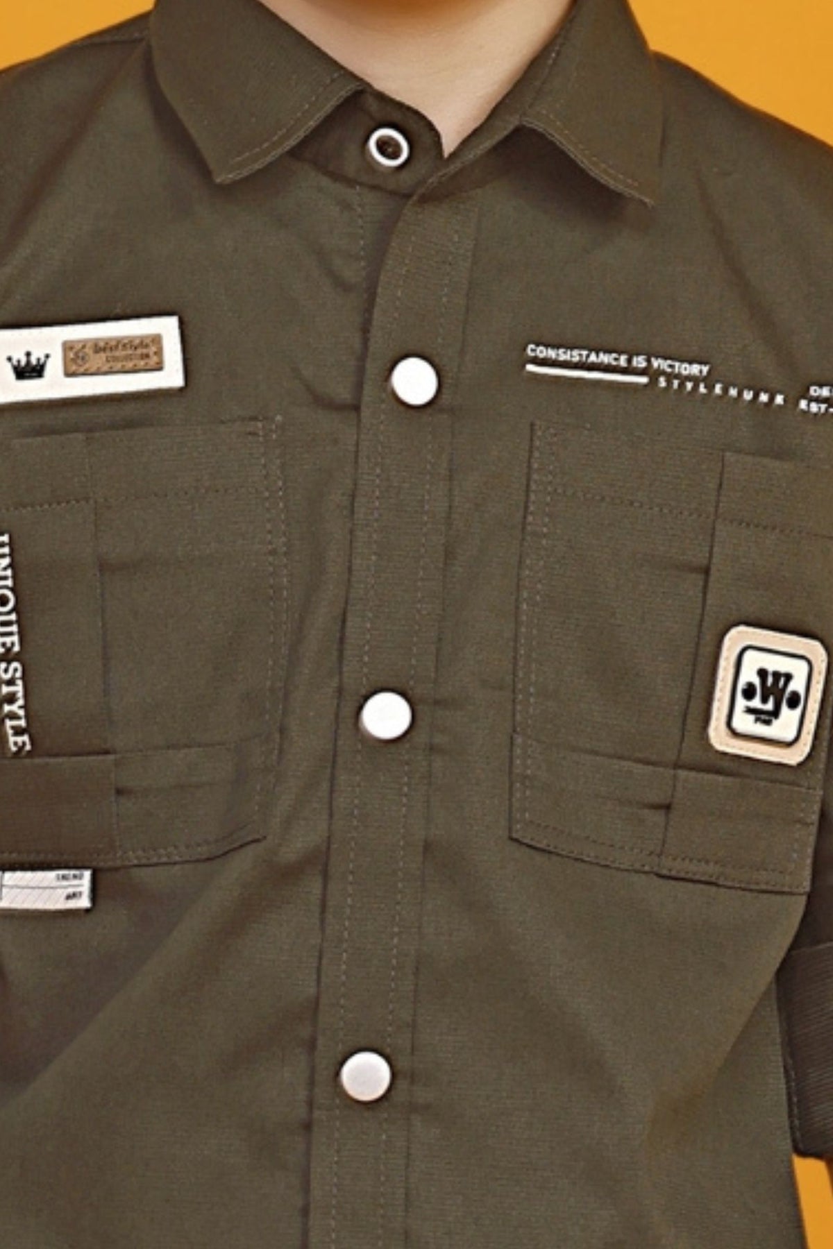 Dark Green Printed Shirt and Cream Pant Set for Boys