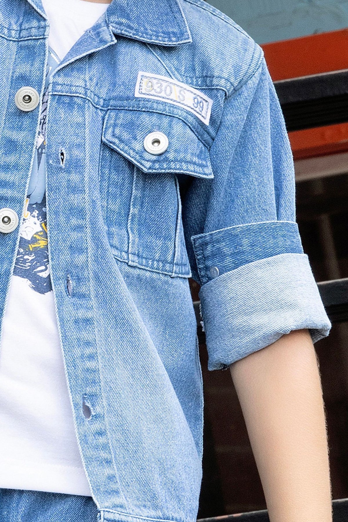 Light Blue with White Printed Blazer, T-Shirt and Pant Set for Boys with Belt
