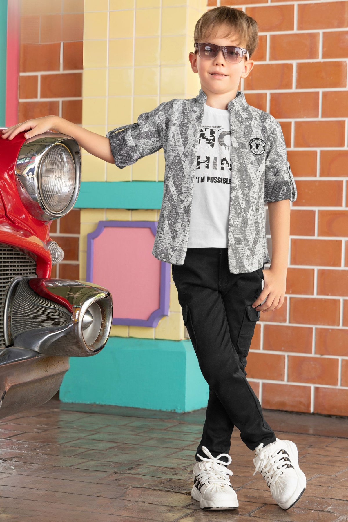 White with Grey Printed Blazer, T-Shirt and Black Pant Set for Boys with Belt