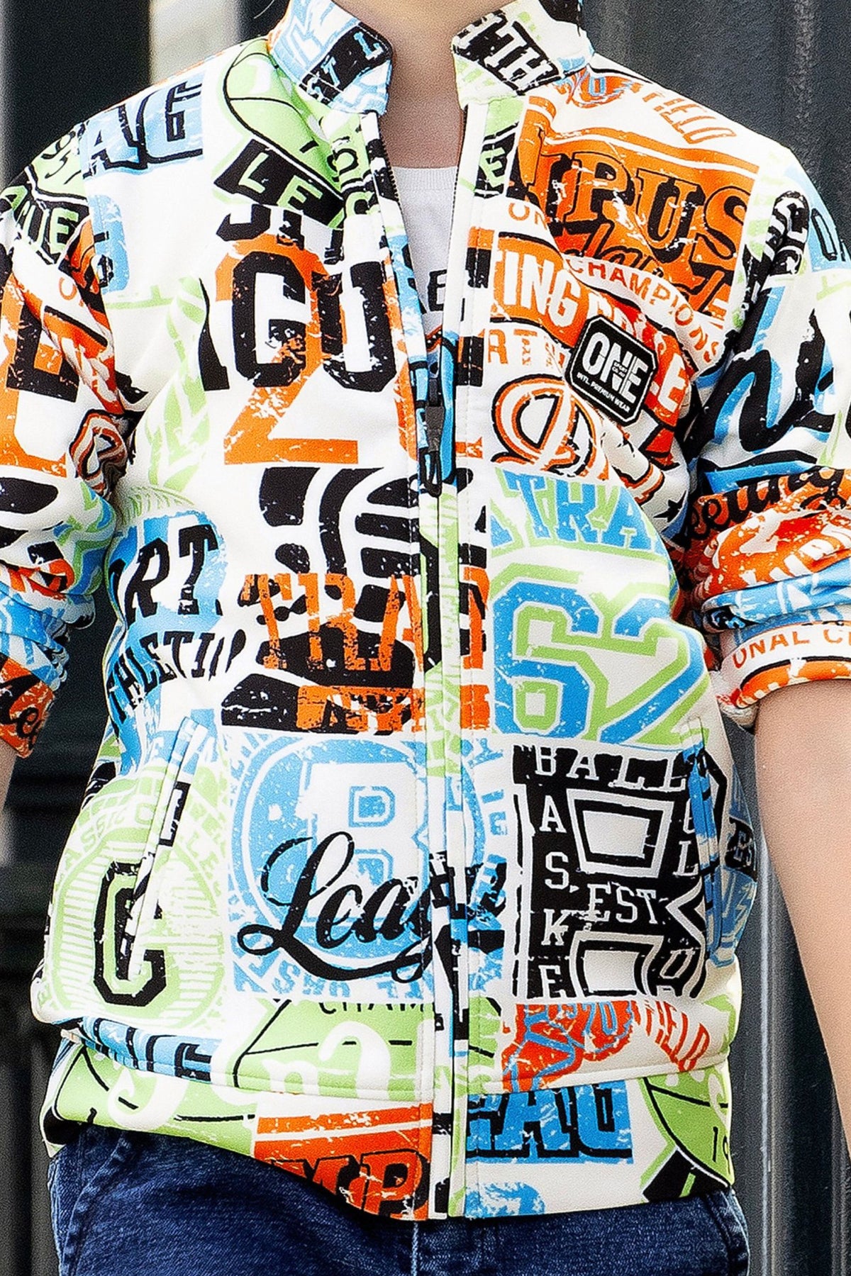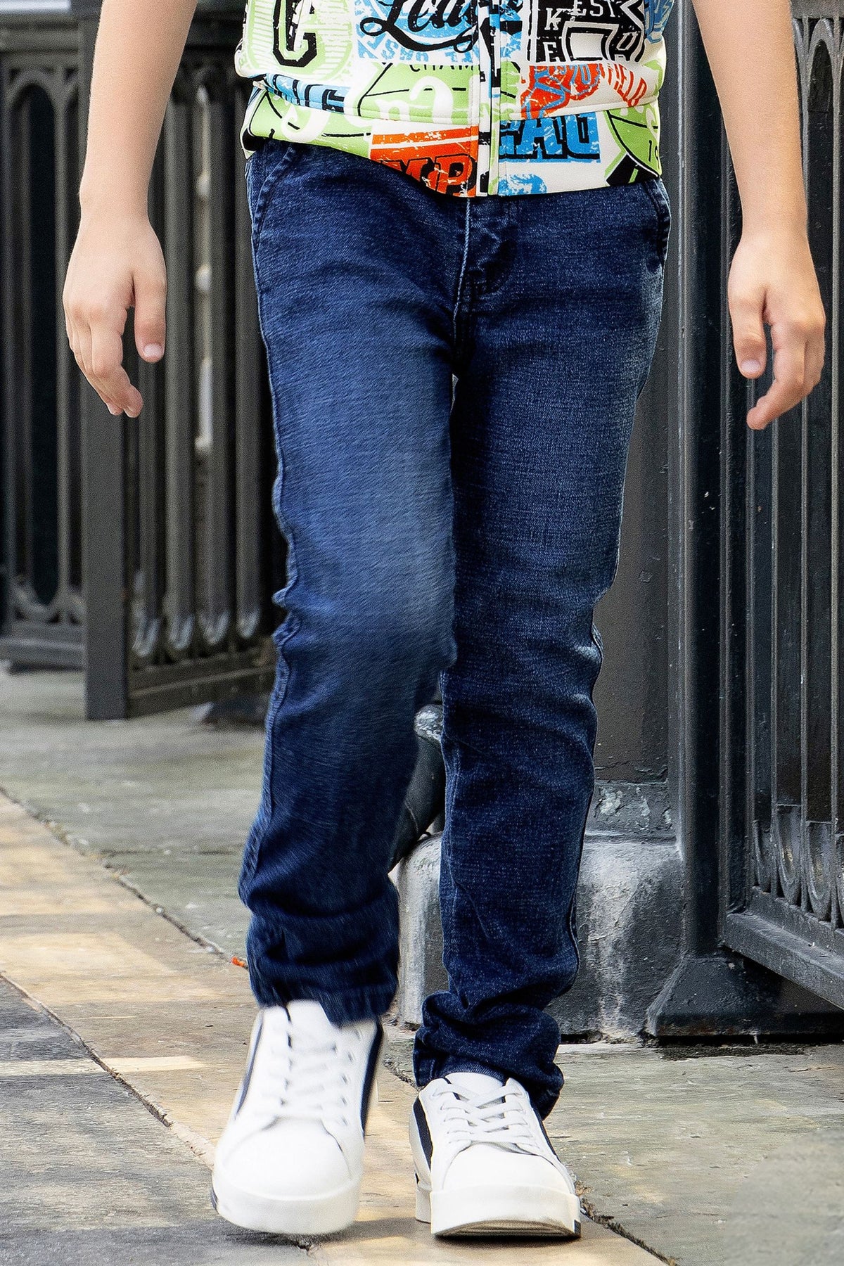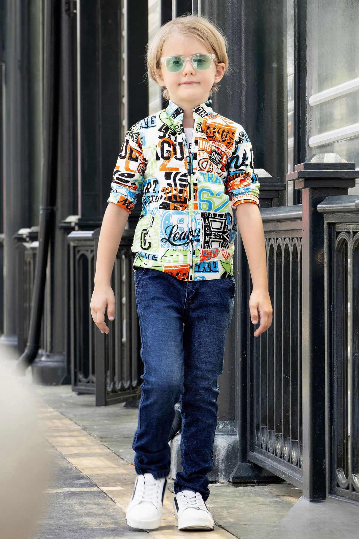 White with Multicolor Printed Blazer, T-Shirt and Blue Pant Set for Boys with Belt