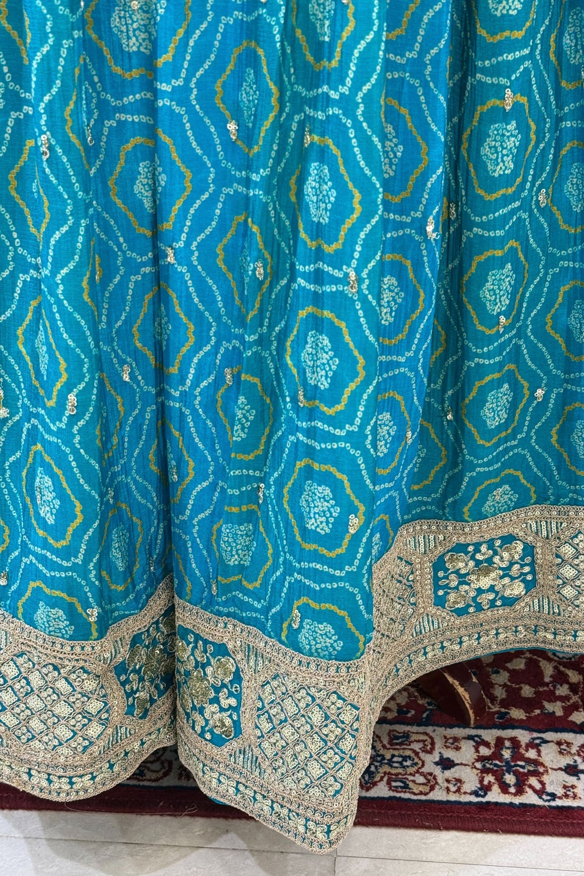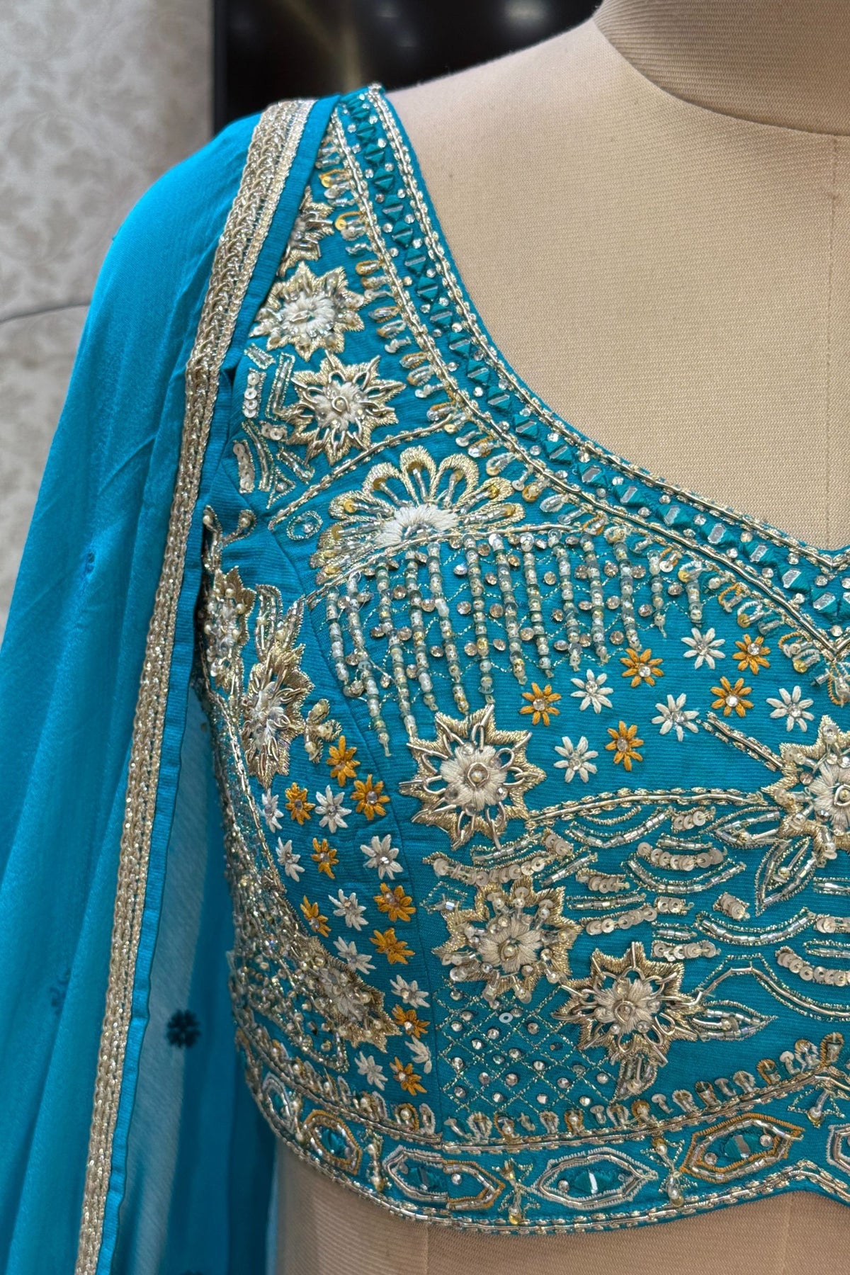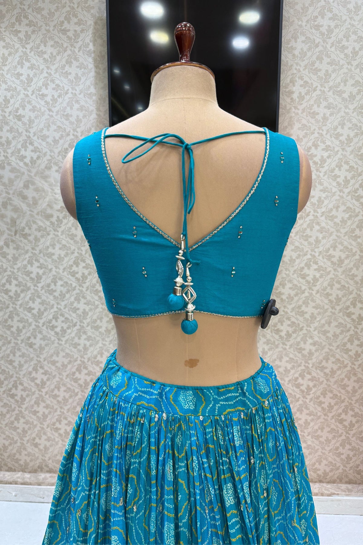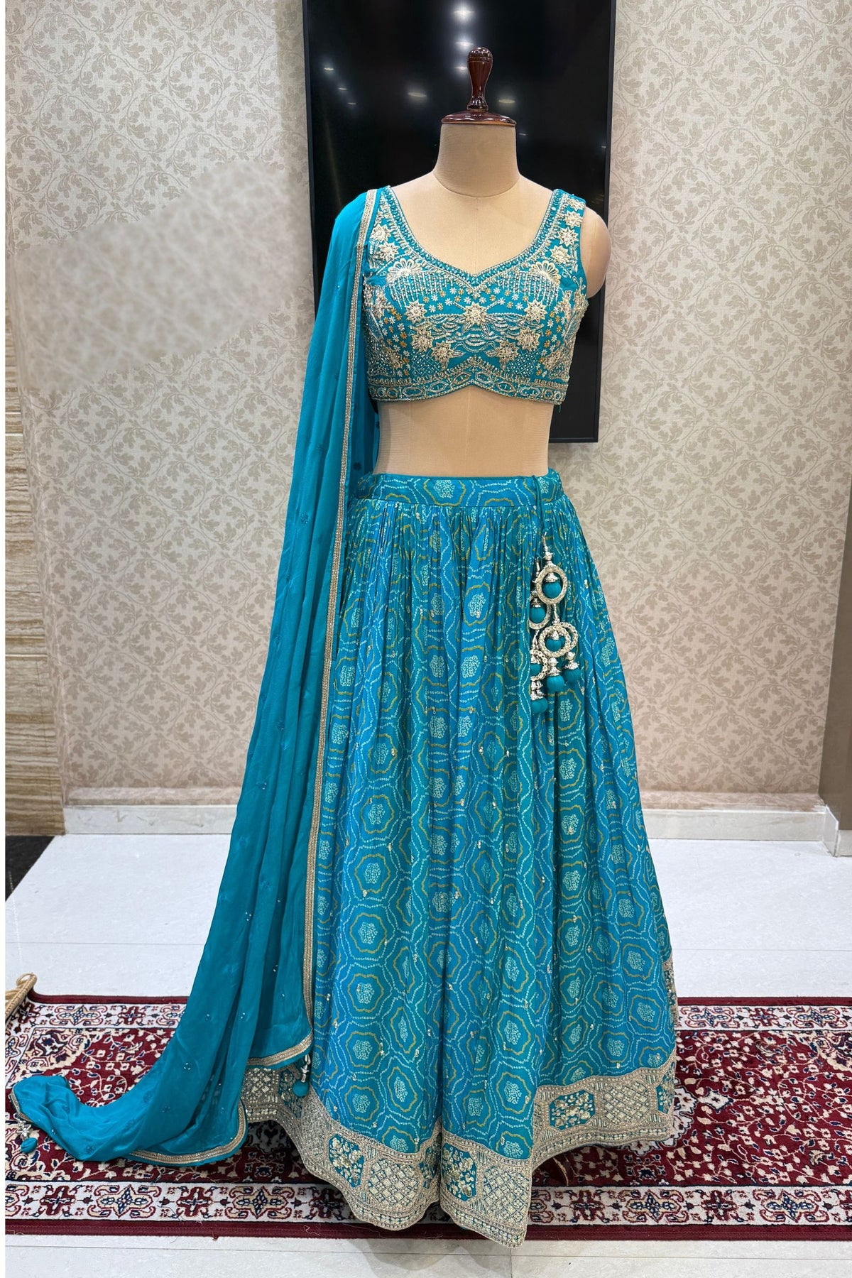 Rama Blue Stone, Zardozi, Sequins and Mirror work with Bandini Print Crop Top Lehenga