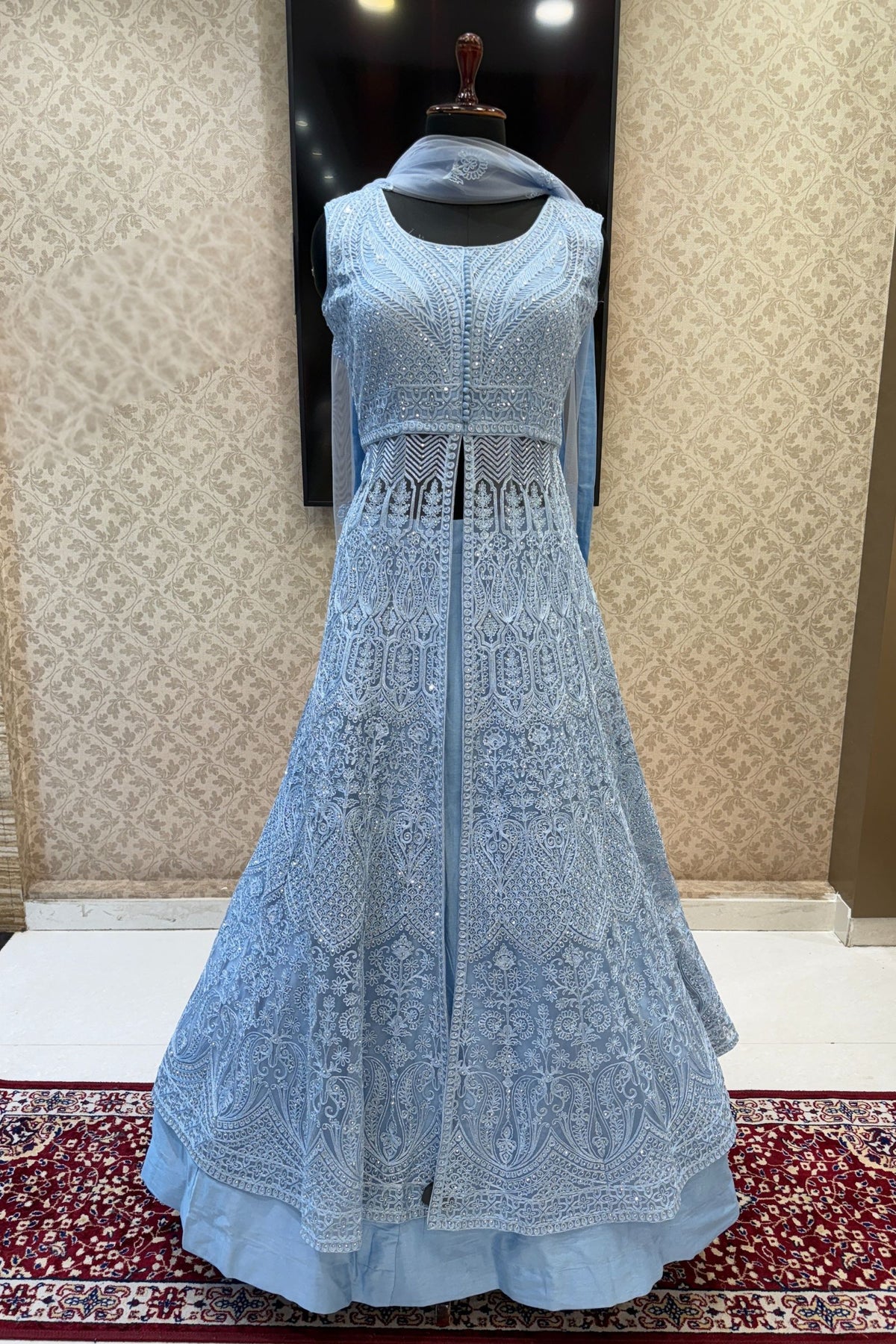 Sea Blue Zari Thread and Stone work Mastani Styled Long Top Lehenga