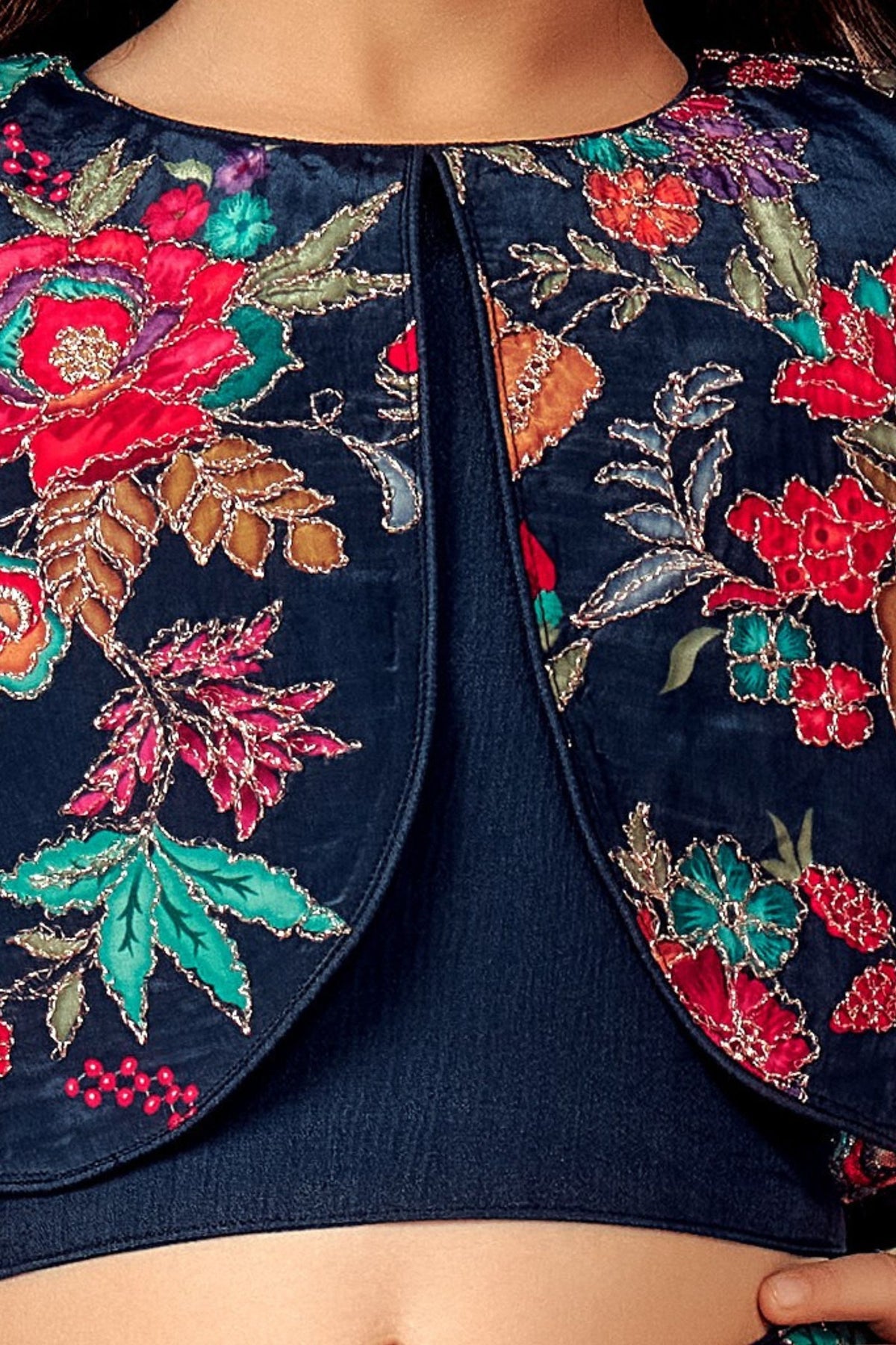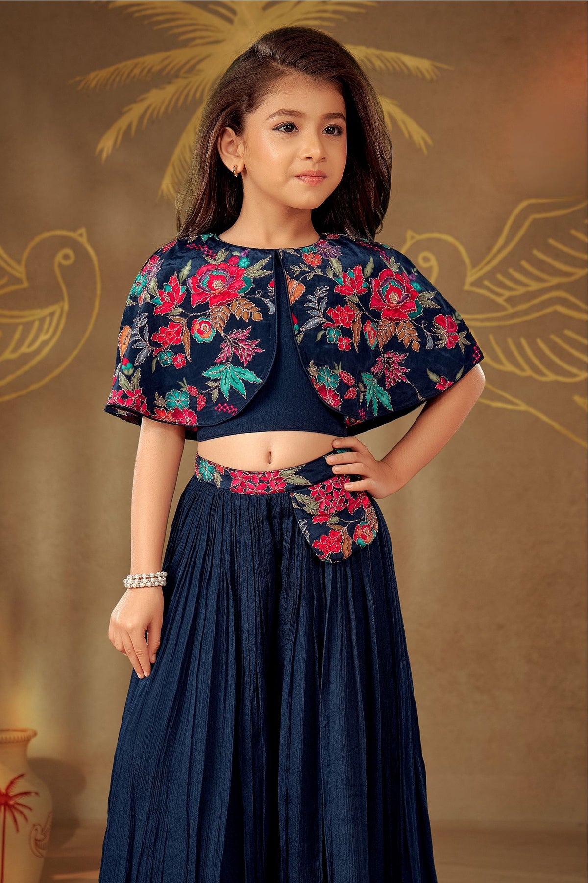 Navy Blue Zari work with Floral Print Poncho Styled Palazzo Suit Set for Girls