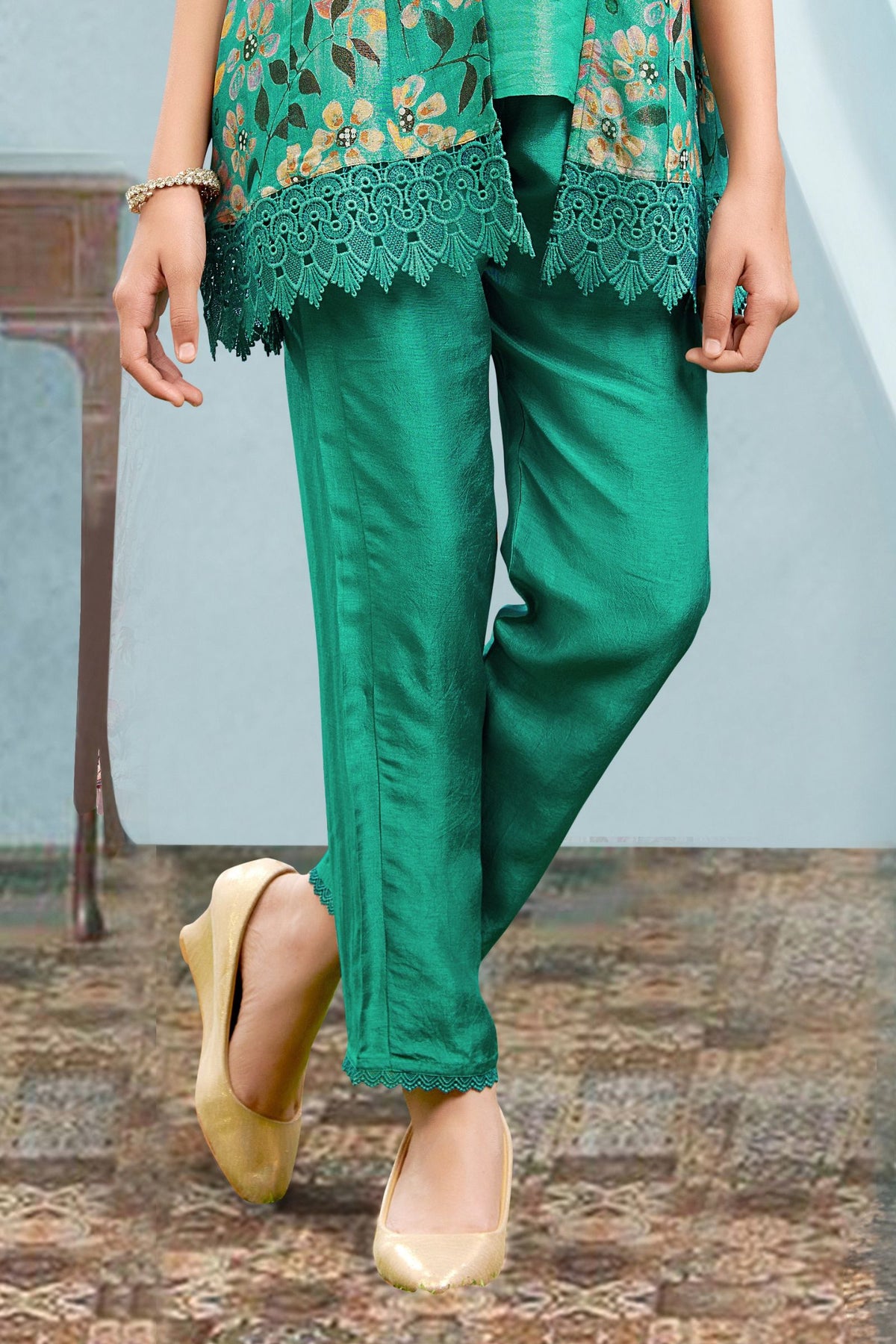 Rama Green Zari Weaving, Beads and Thread work with Digital Print Overcoat Salwar Suit for Girls