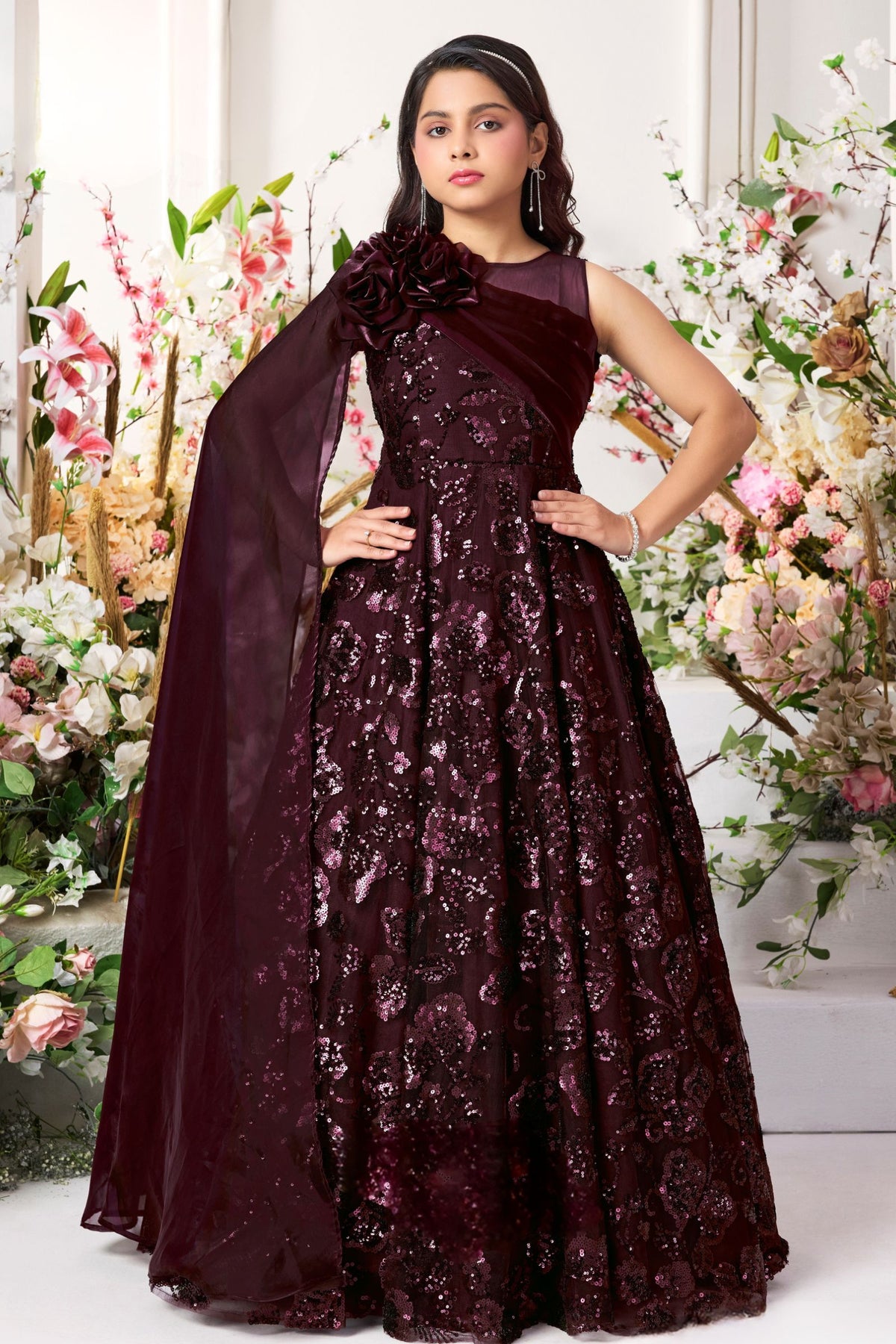 Wine Sequins work Long Party Gown for Girls