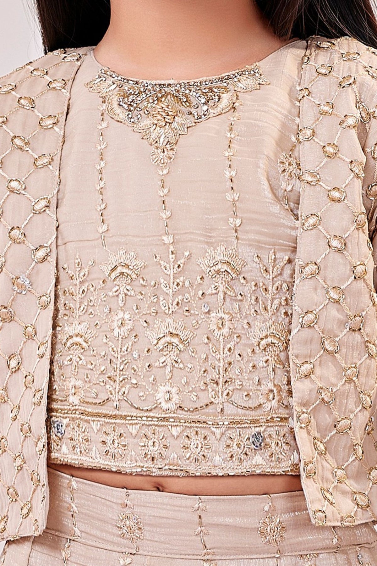 Beige Thread, Stone and Zardozi work Jacket Styled Palazzo Set For Girls