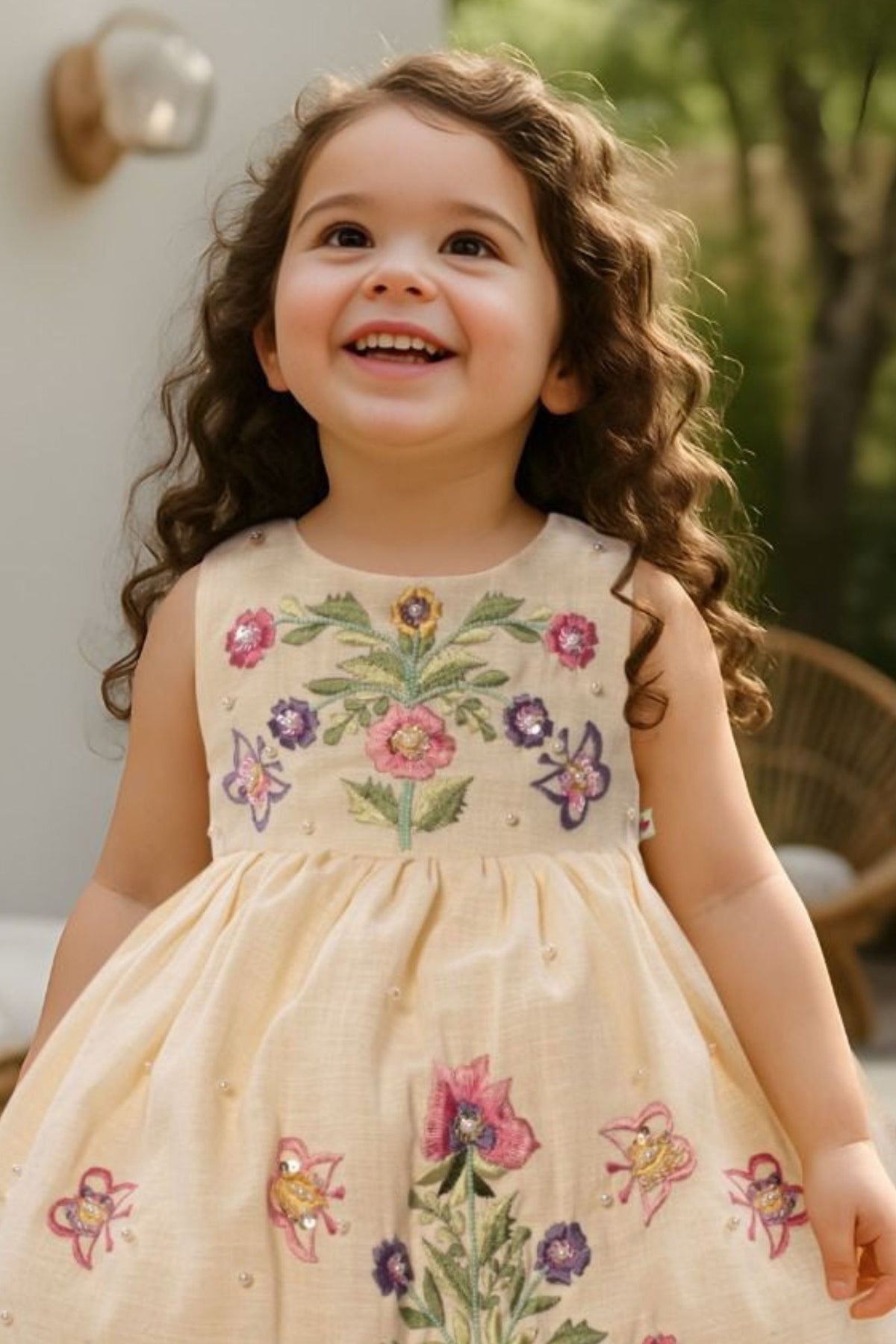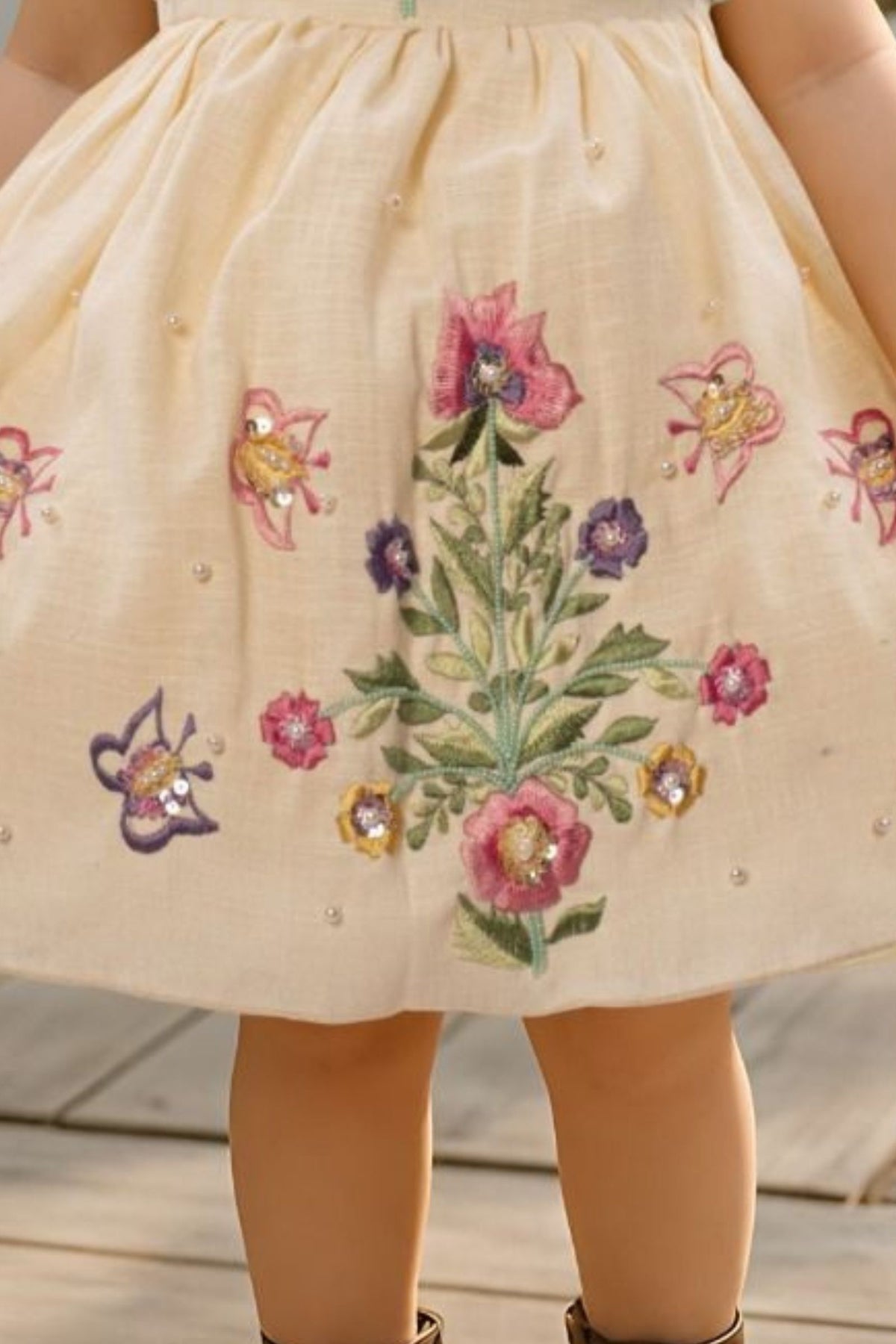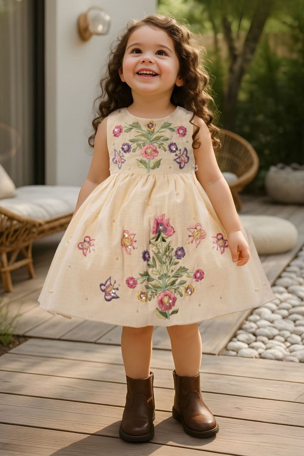 Cream Embroidery, Sequins and Beads work Short Partywear Frock for Girls