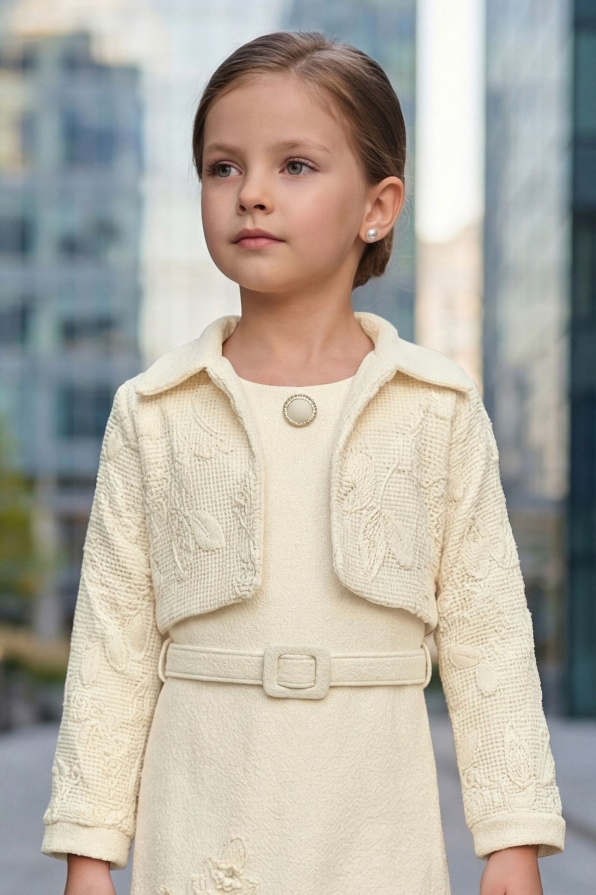 Cream Sequins, Stone, Thread and Zari Weaving work Jacket Styled Short Frock For Girls with Belt