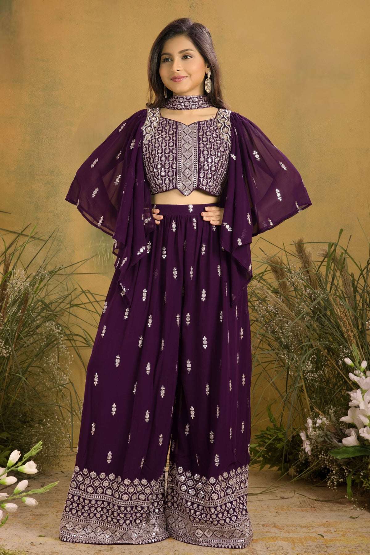 Dark Purple Sequins, Zari, Stone and Beads work Choli and Palazzo Set for Girls