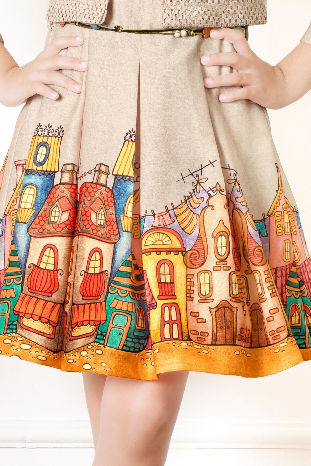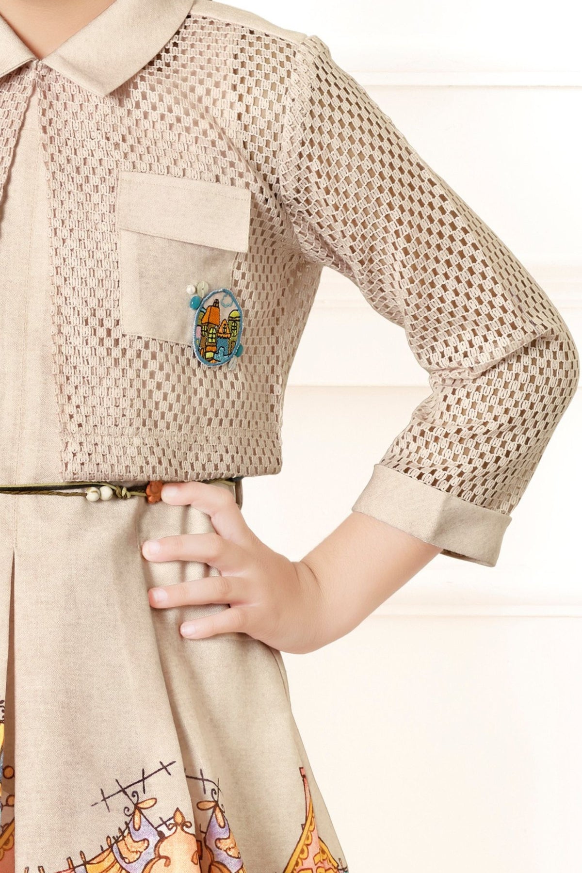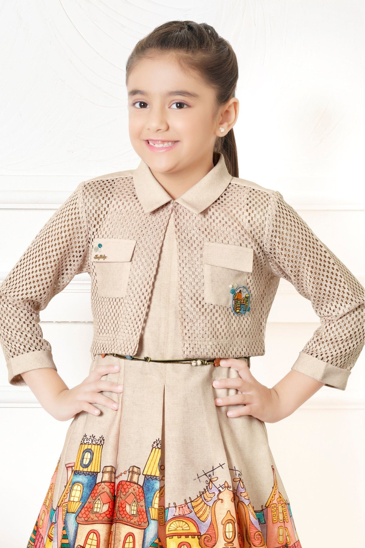 Fawn with Digital Print Jacket Styled Short Casual Frock For Girls