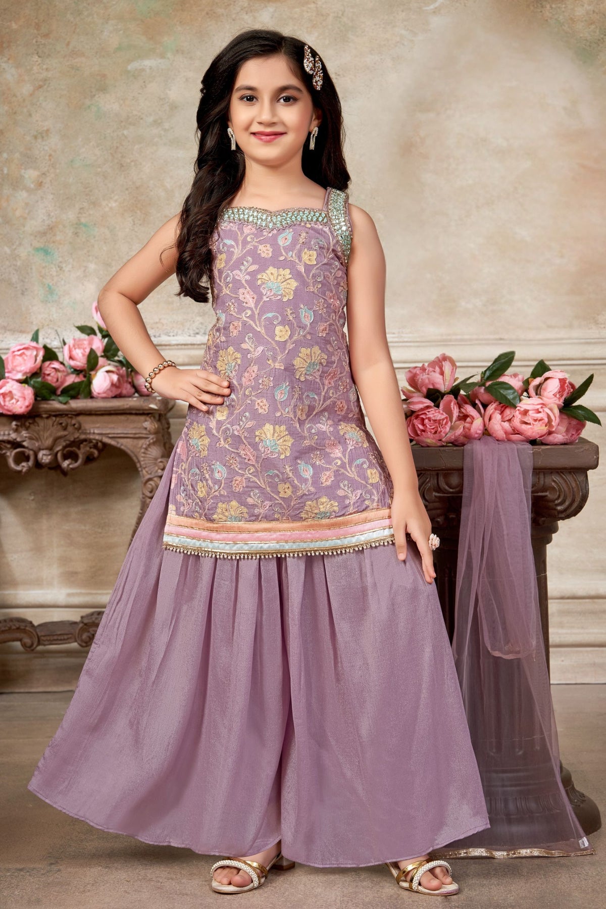 Lavender Zari, Stone, Mirror and Beads work with Floral Print Palazzo Suit Set for Girls