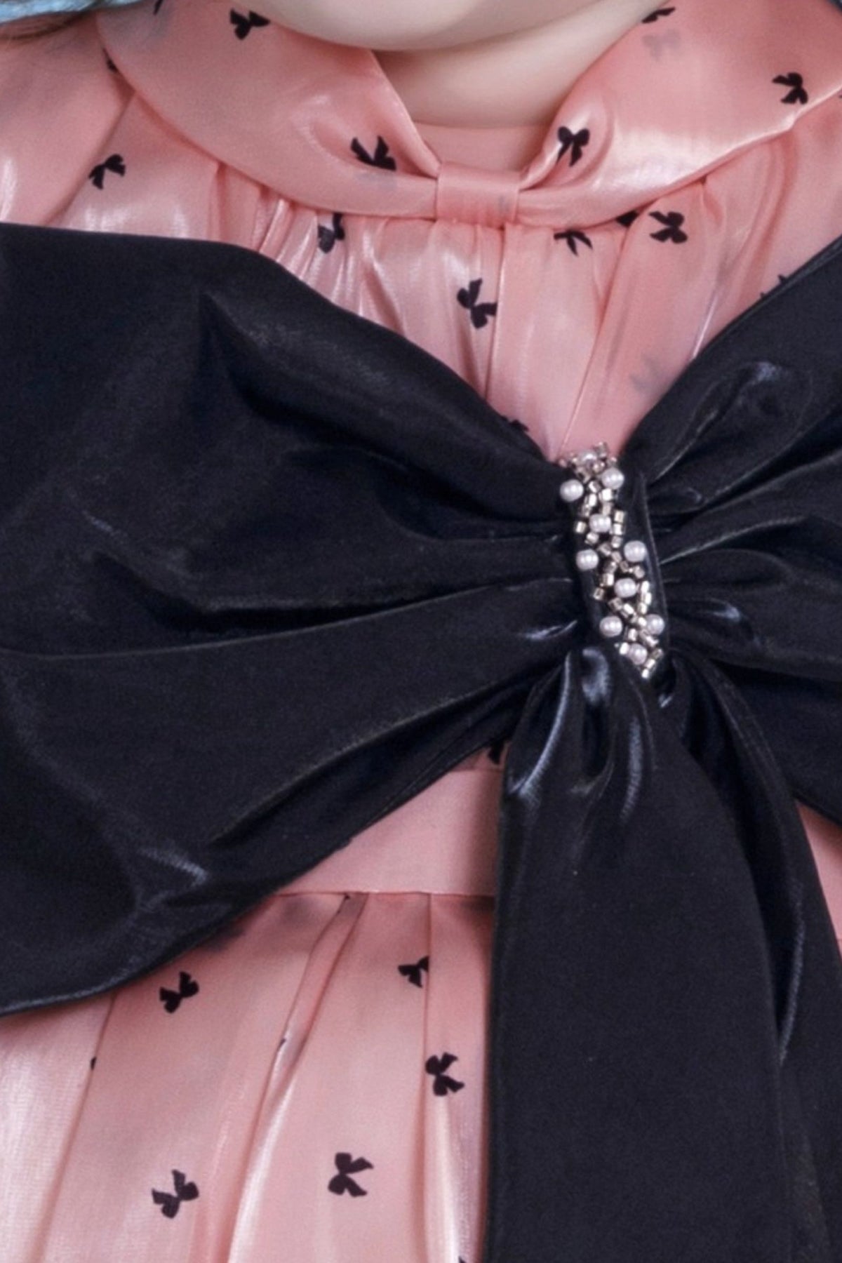 Peach with Black Printed Partywear Short Frock for Girls with Bow