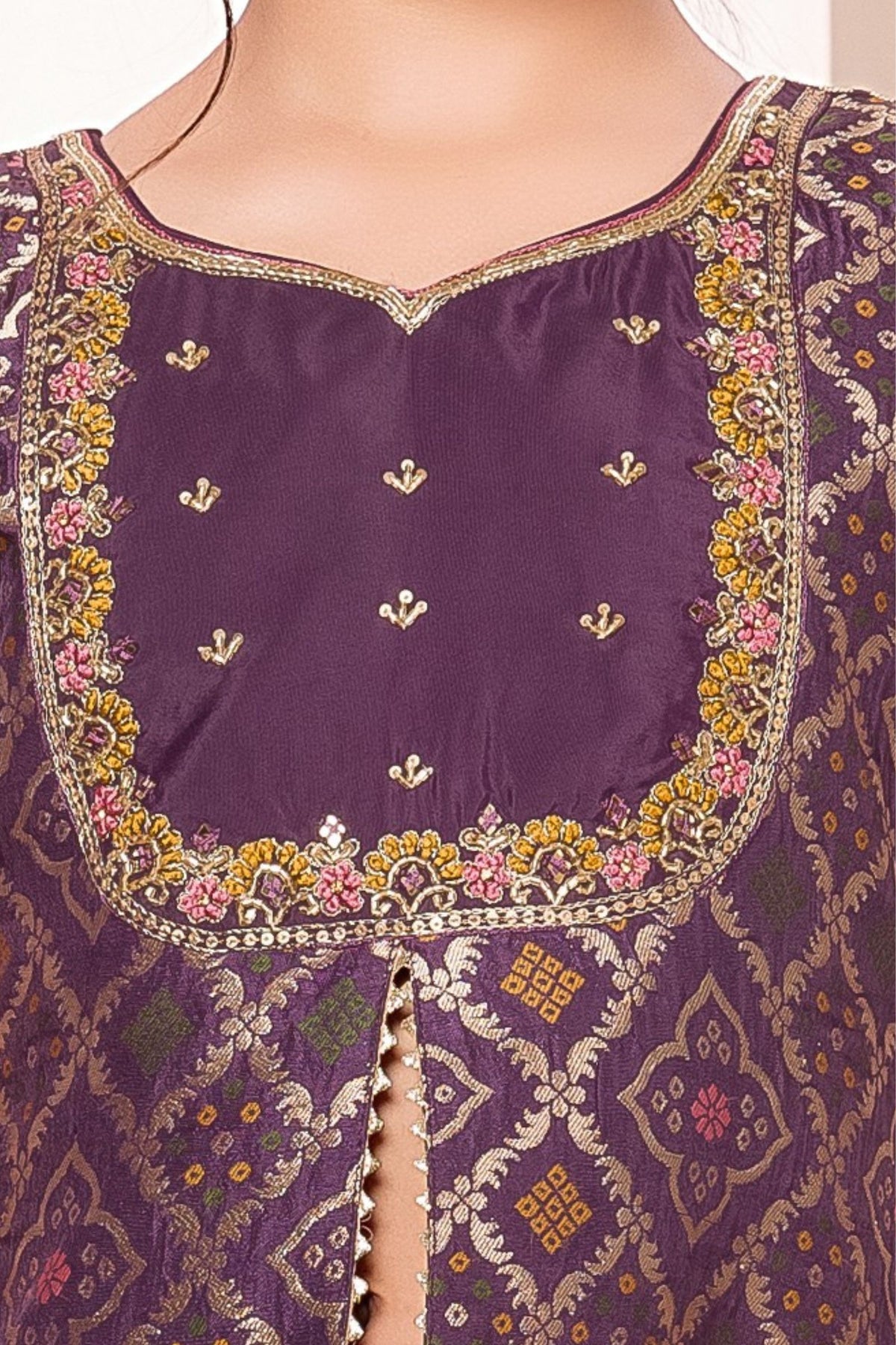 Purple Banaras Zari, Mirror and Beads work Palazzo Suit Set for Girls
