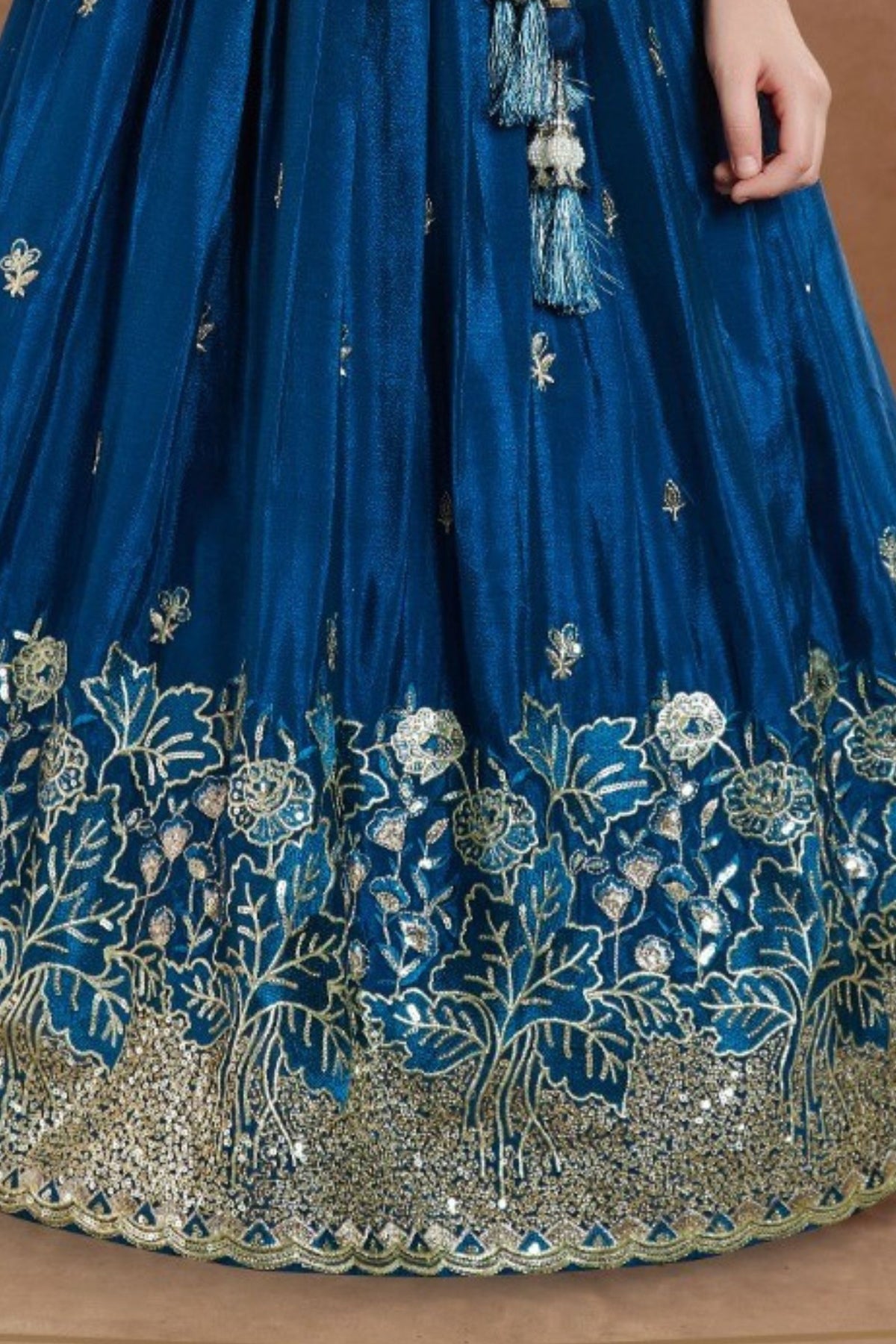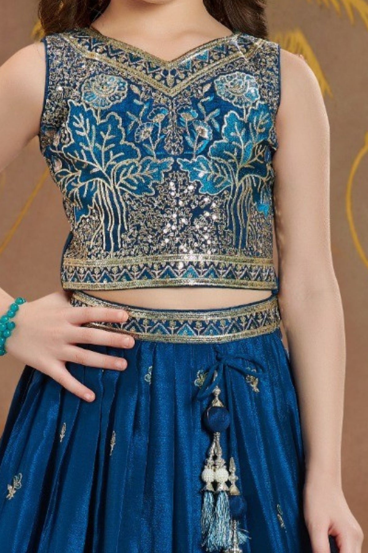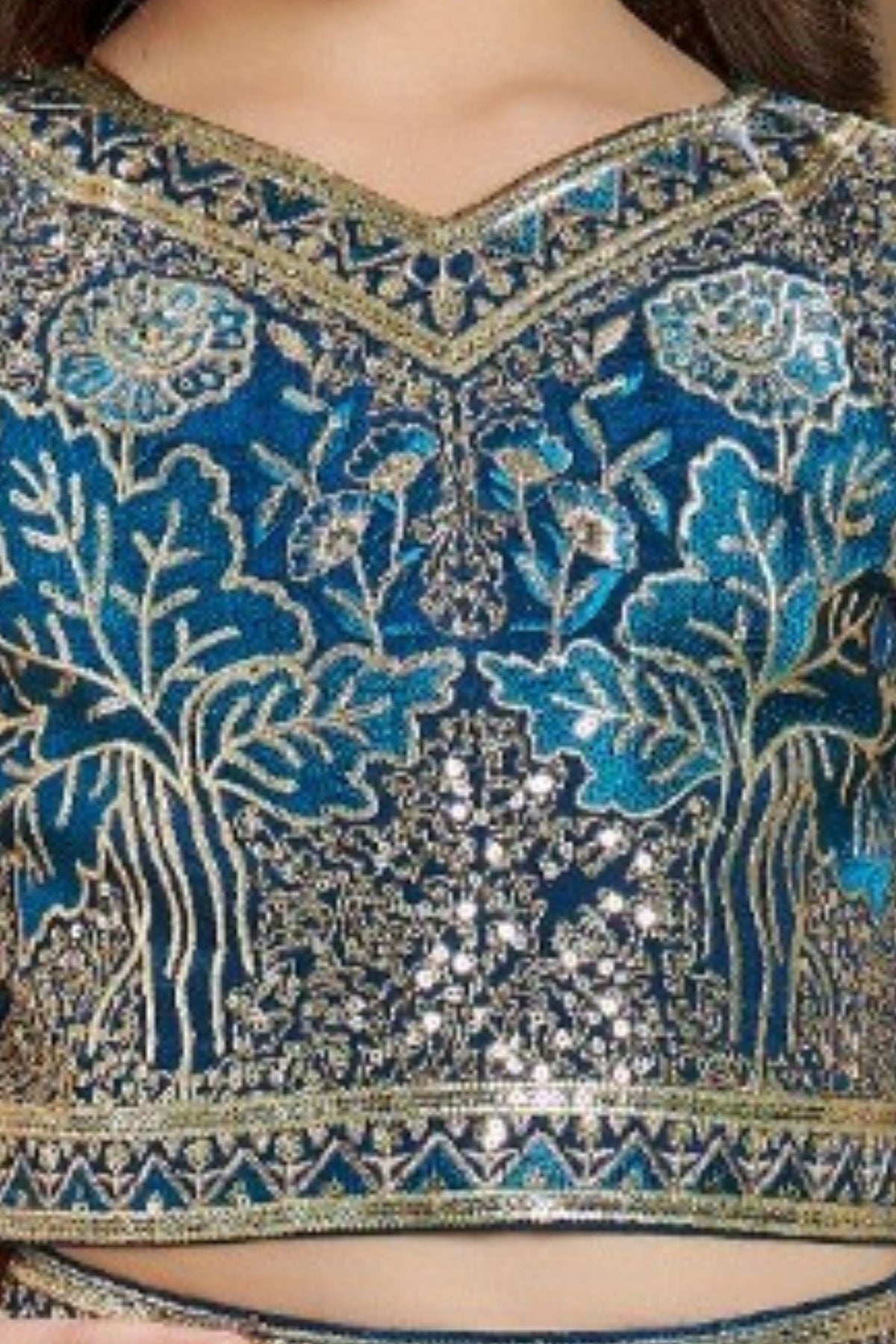 Teal Blue Sequins, Zari and Thread work Lehenga Choli for Girls