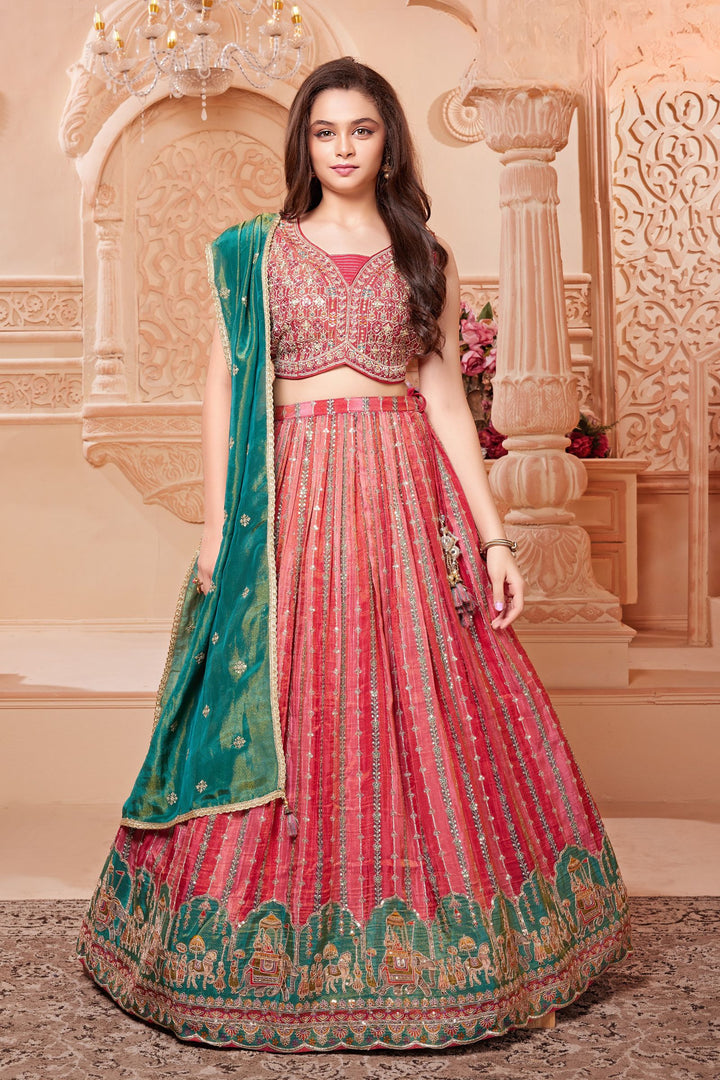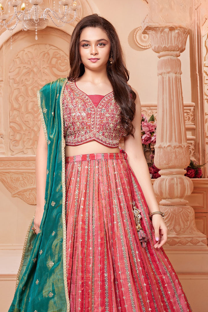 Tomato Red Mirror, Beads, Zari, Sequins and Stone work Lehenga Choli for Girls