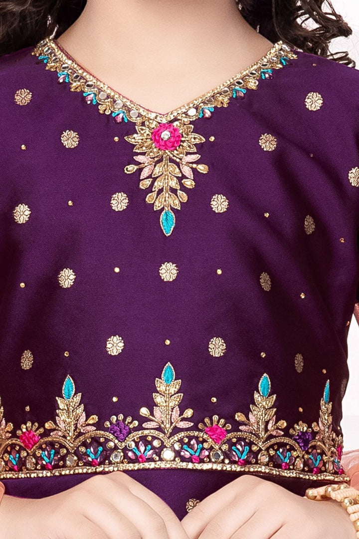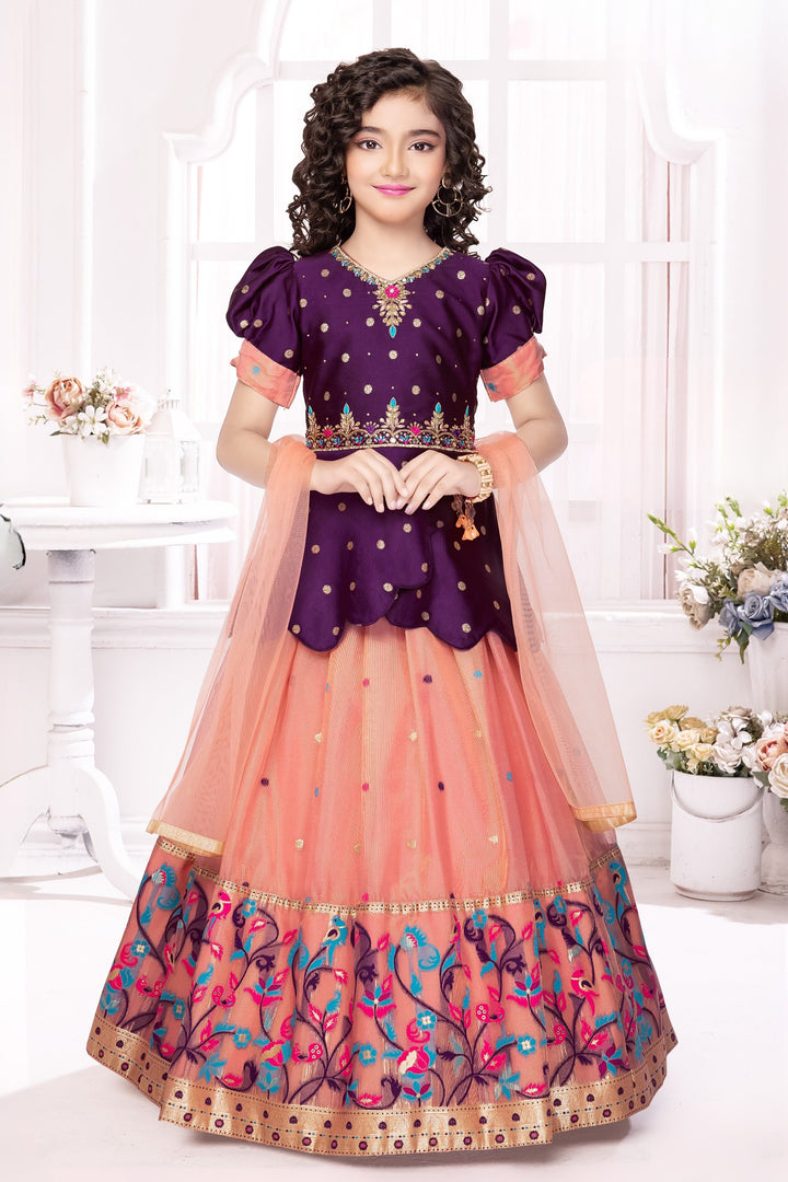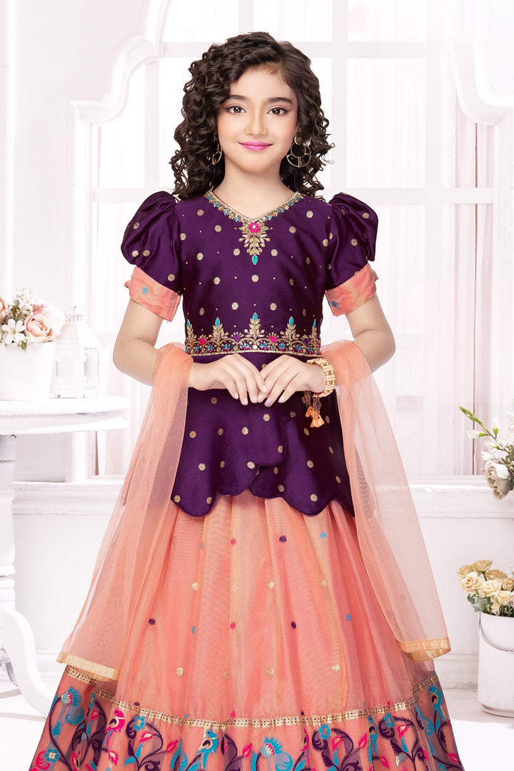 Wine with Peach Banaras Zari, Stone, Sequins and Mirror work Lehenga Choli for Girls