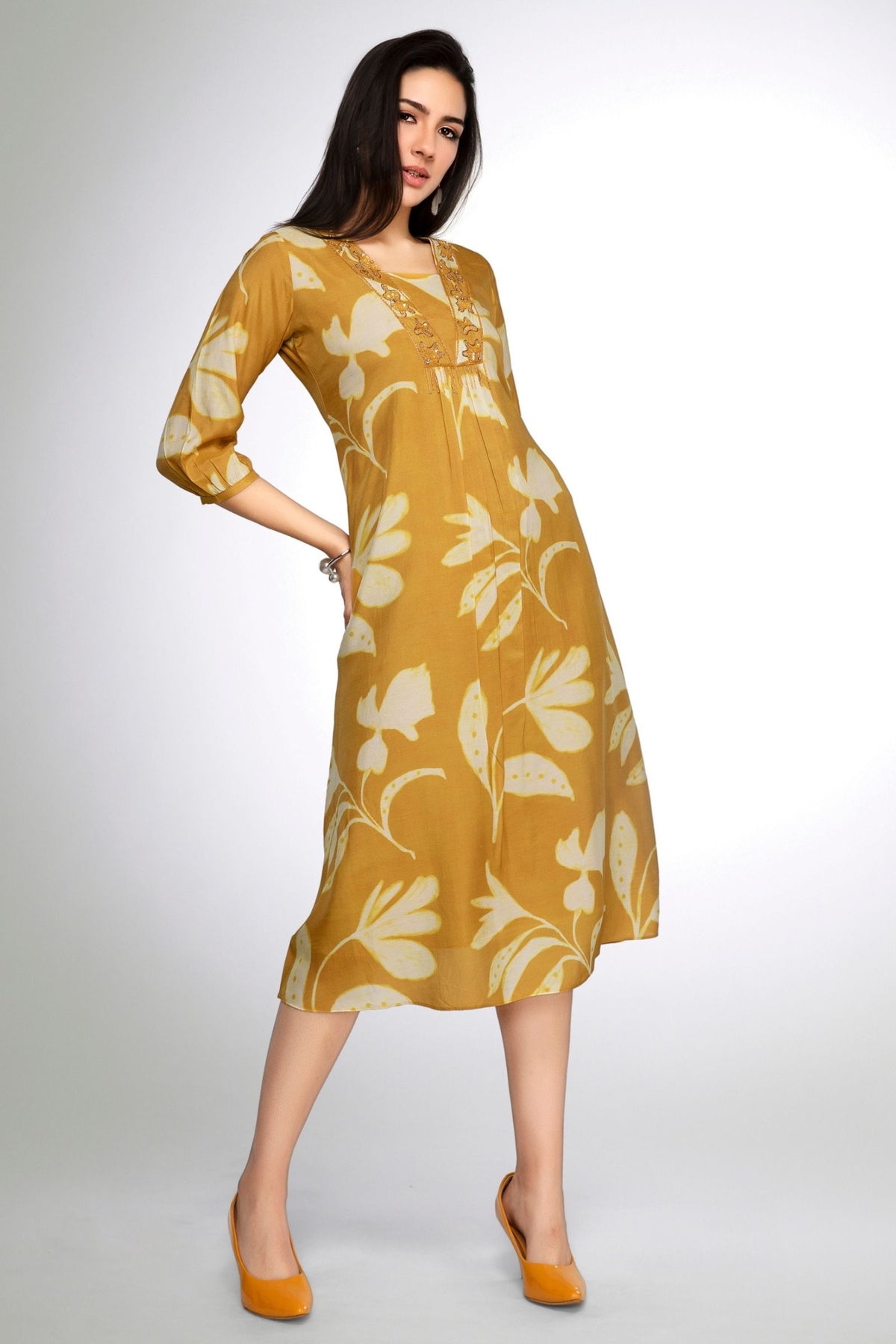 Mustard Beads and Thread work with Digital Print A-line Cut Calf Length Kurti