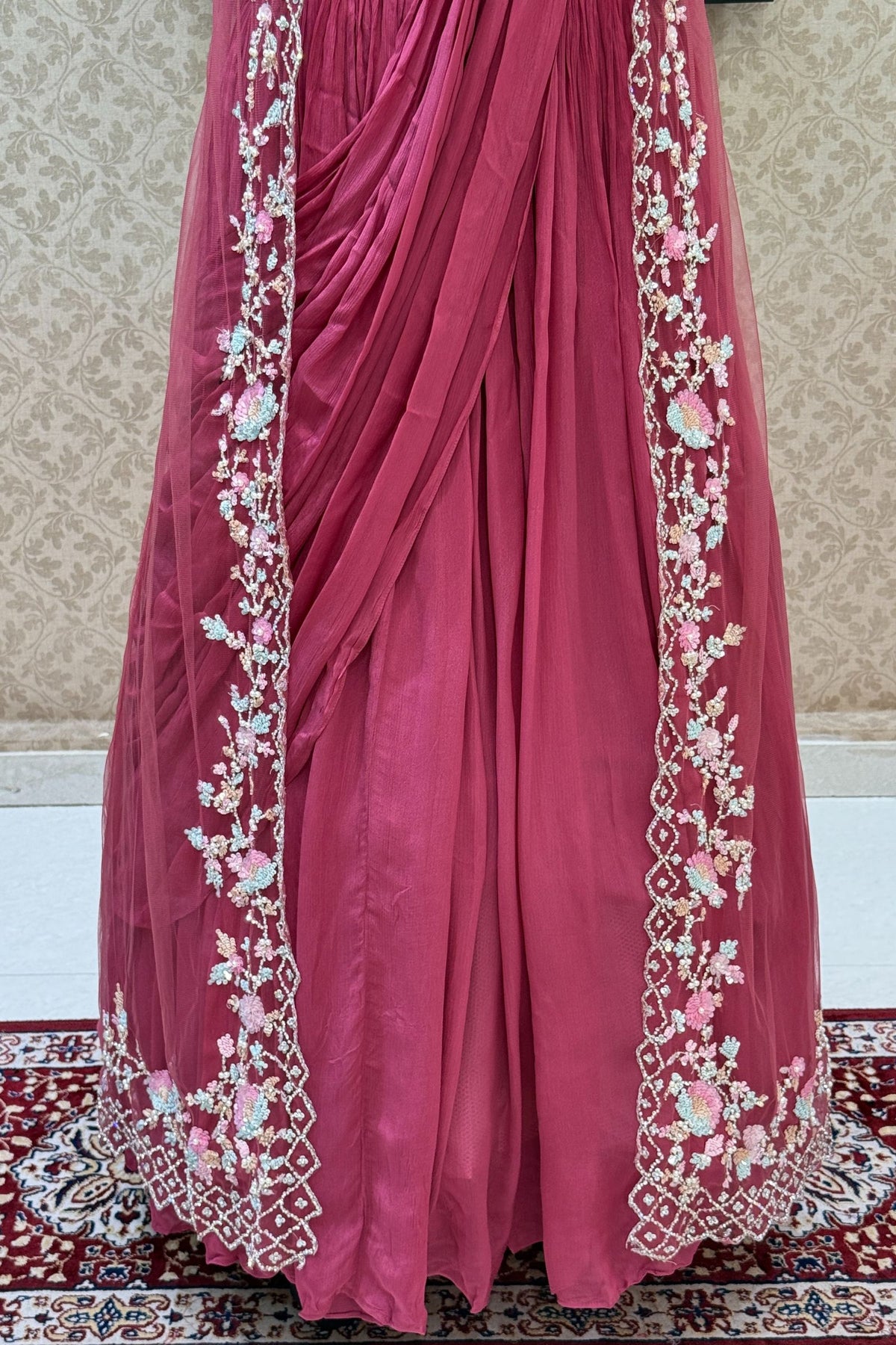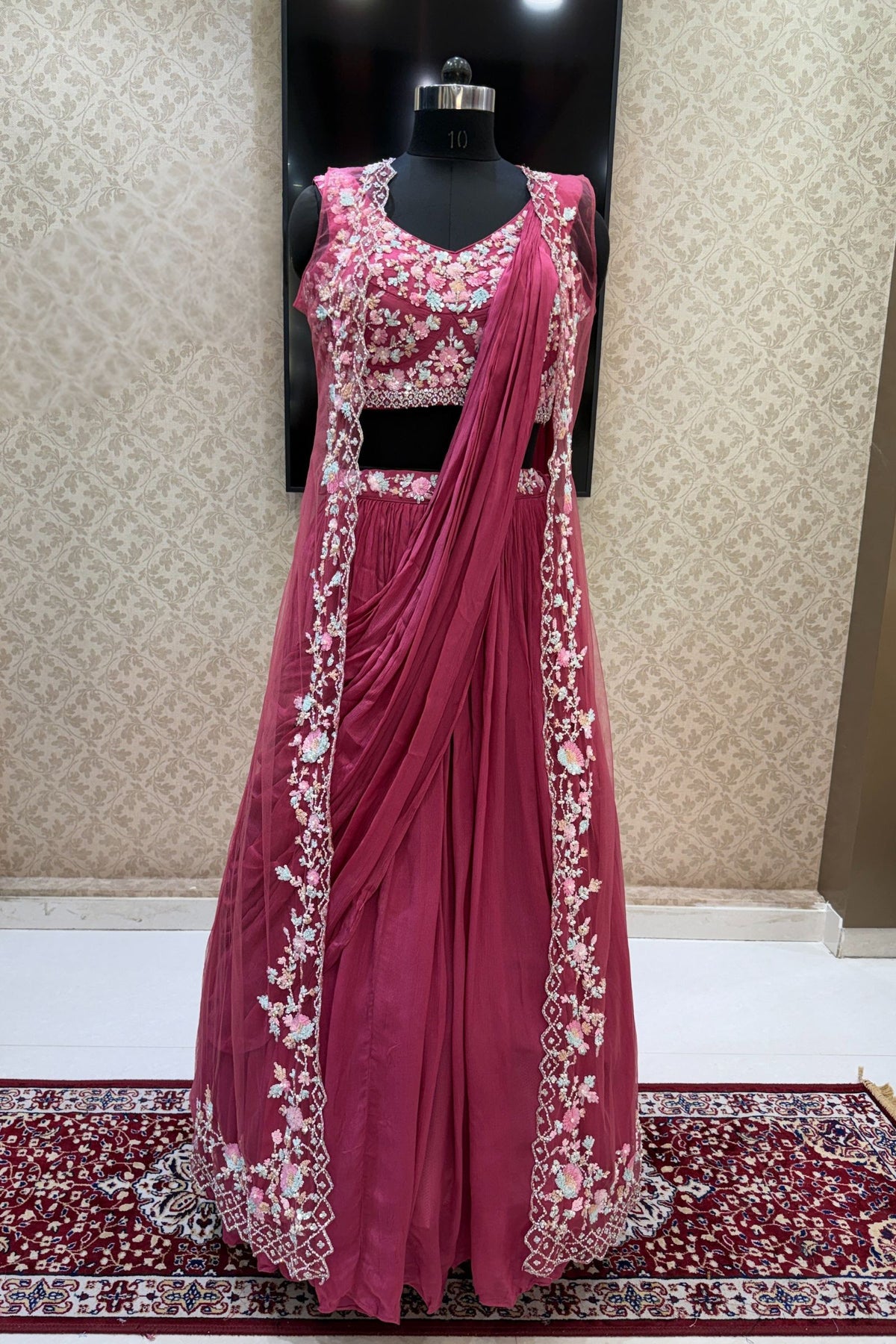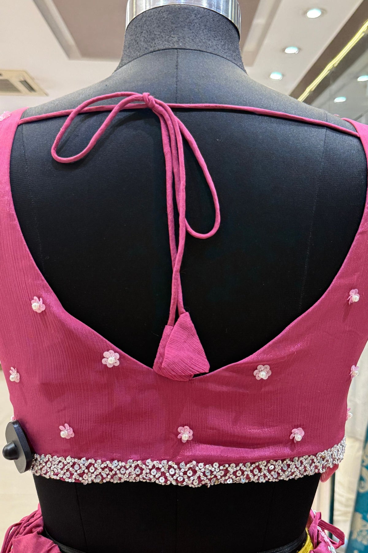 Onion Pink Sequins, Stone and Pearl work Indo-Western Styled Crop Top Lehenga with Overcoat