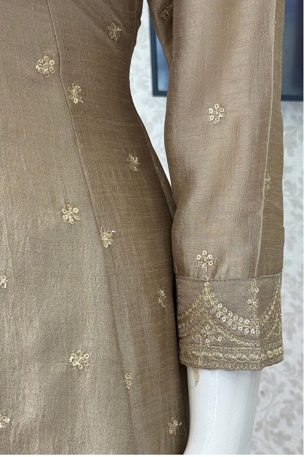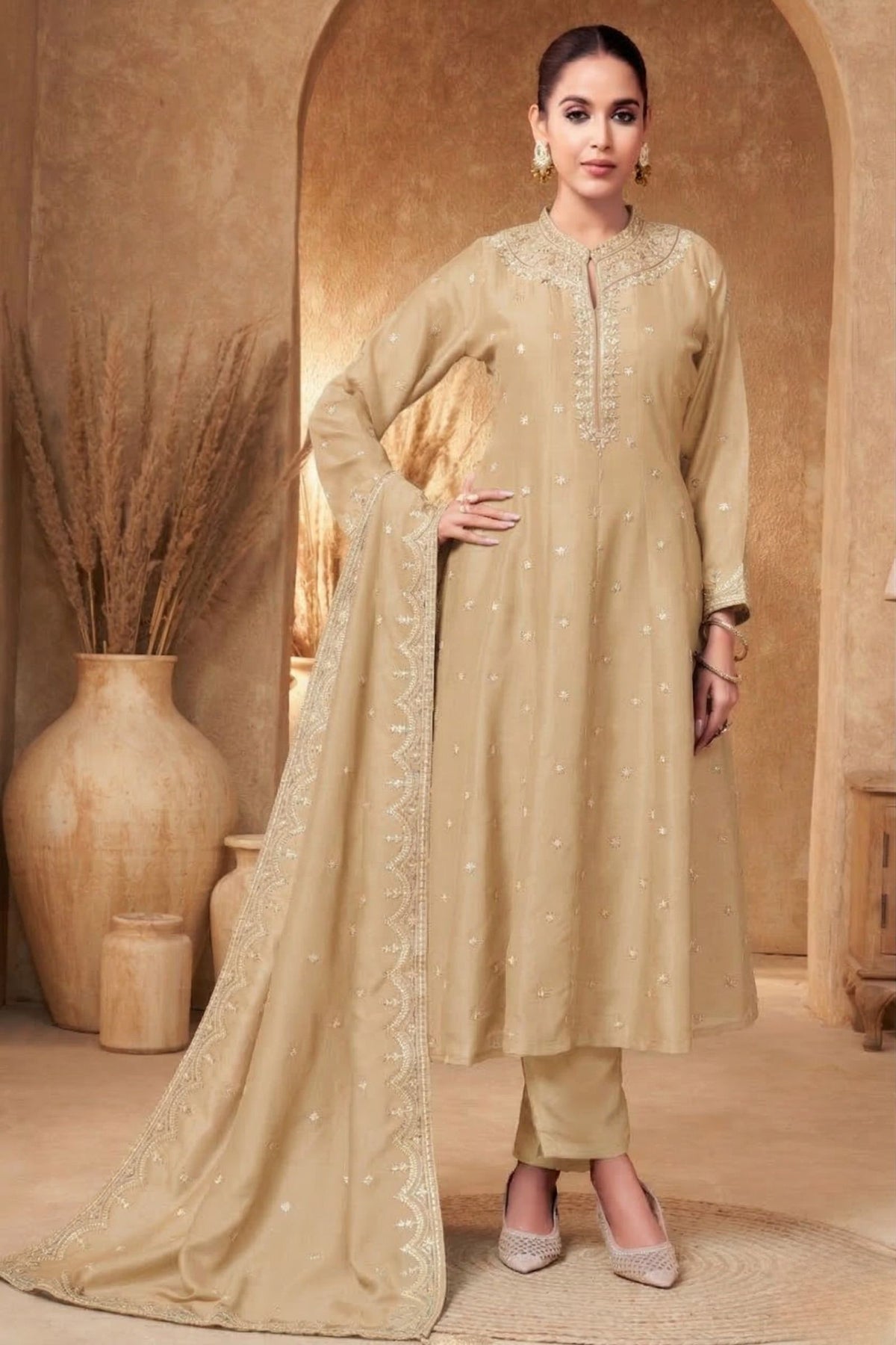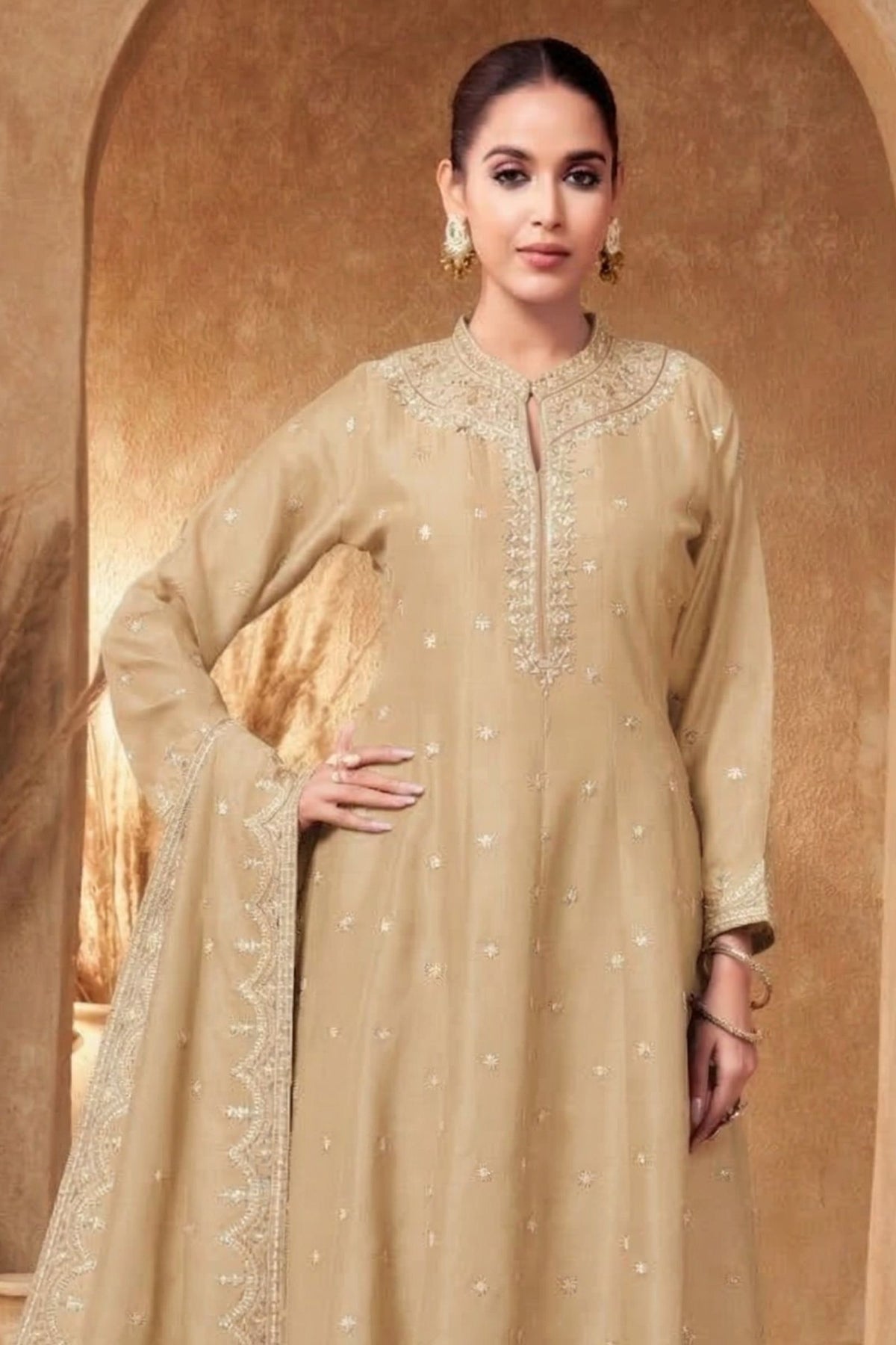 Beige Zari, Zardozi, Sequins and Stone work A-line Cut Salwar Suit