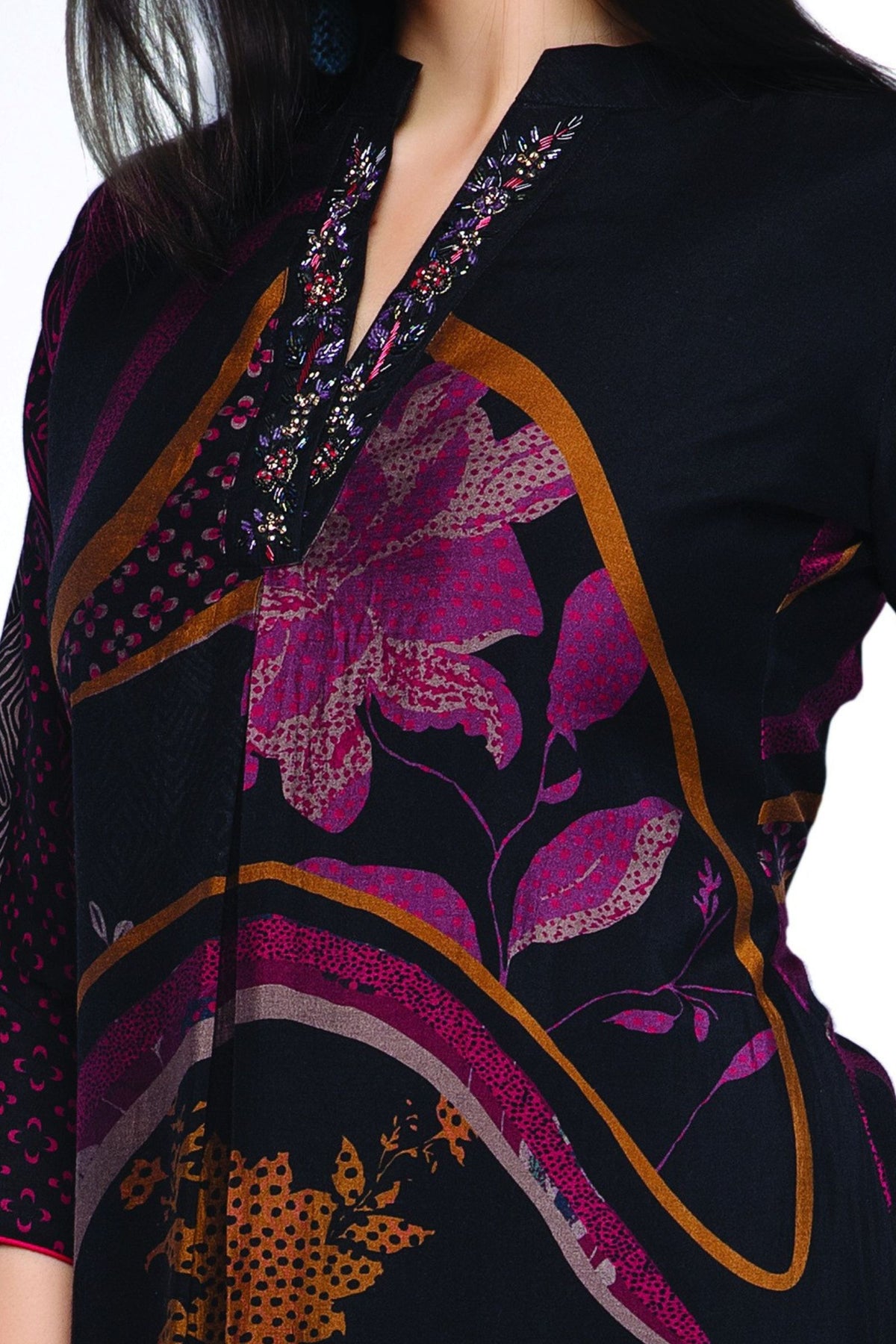 Black Multicolor Digital Print, Beads, Stone and Zardozi work Calf Length Kurti