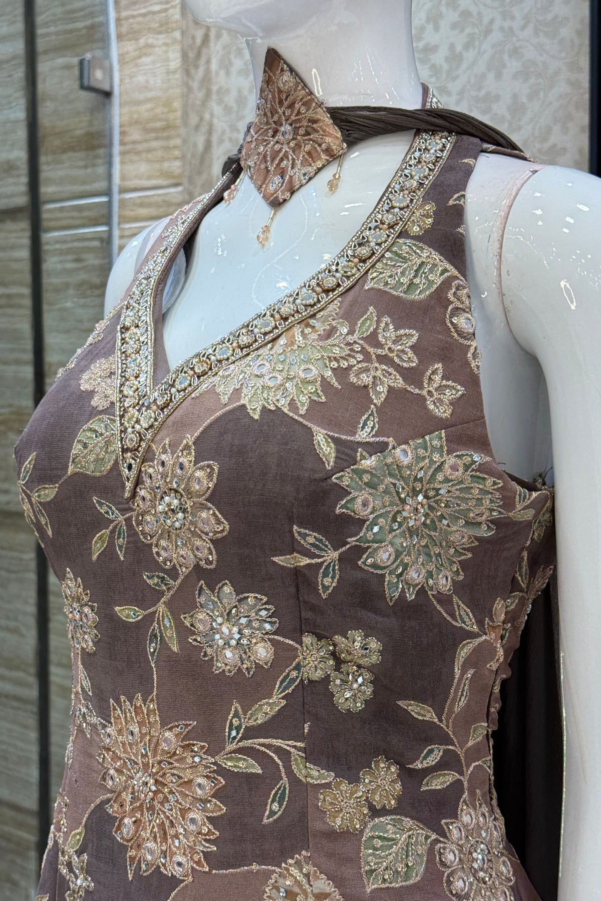 Brown Zari, Beads, Mirror and Zardozi work Palazzo Salwar Suit