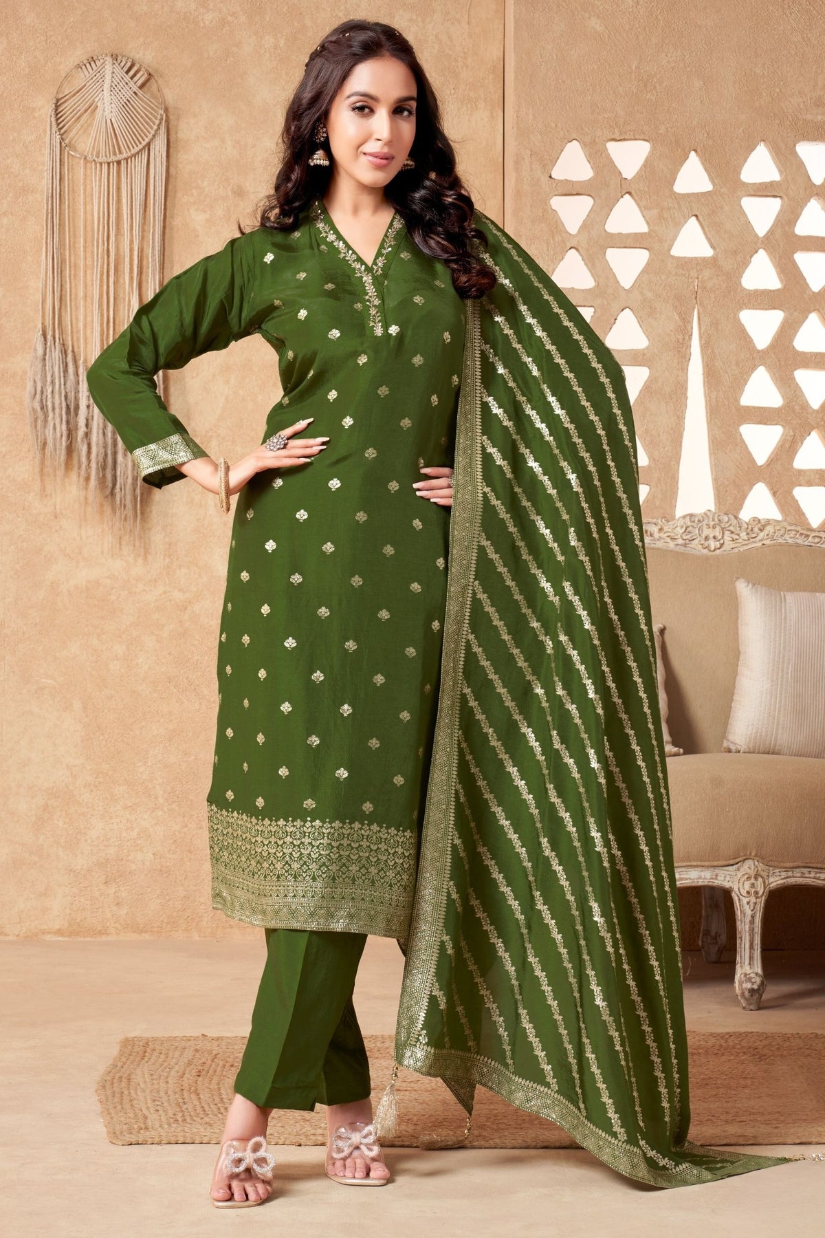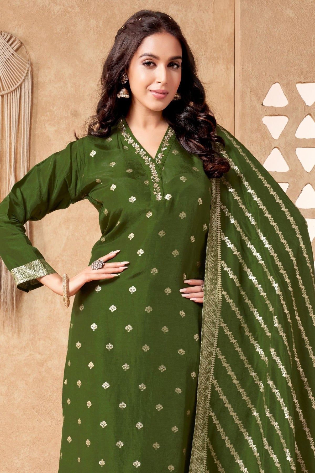 Green Banaras, Zardozi, Beads and Sequins work Straight Cut Salwar Suit