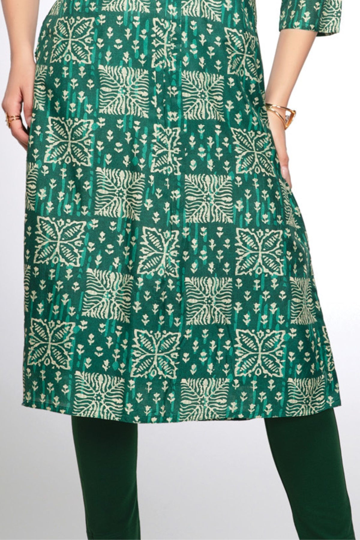 Green Beads and Sequins work with Digital Print Calf Length Kurti
