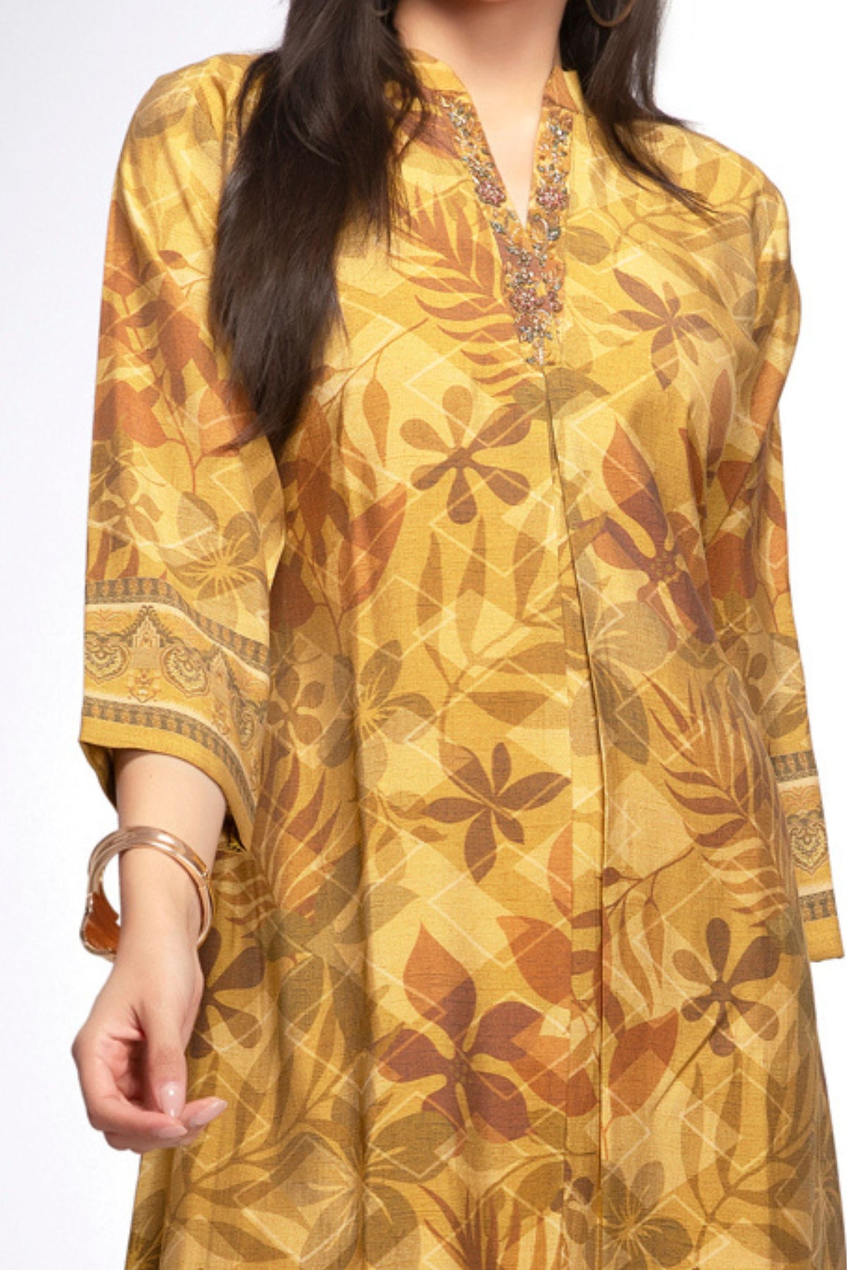 Mustard Beads, Sequins and Zardozi work with Digital Print A-Line Cut Calf Length Kurti