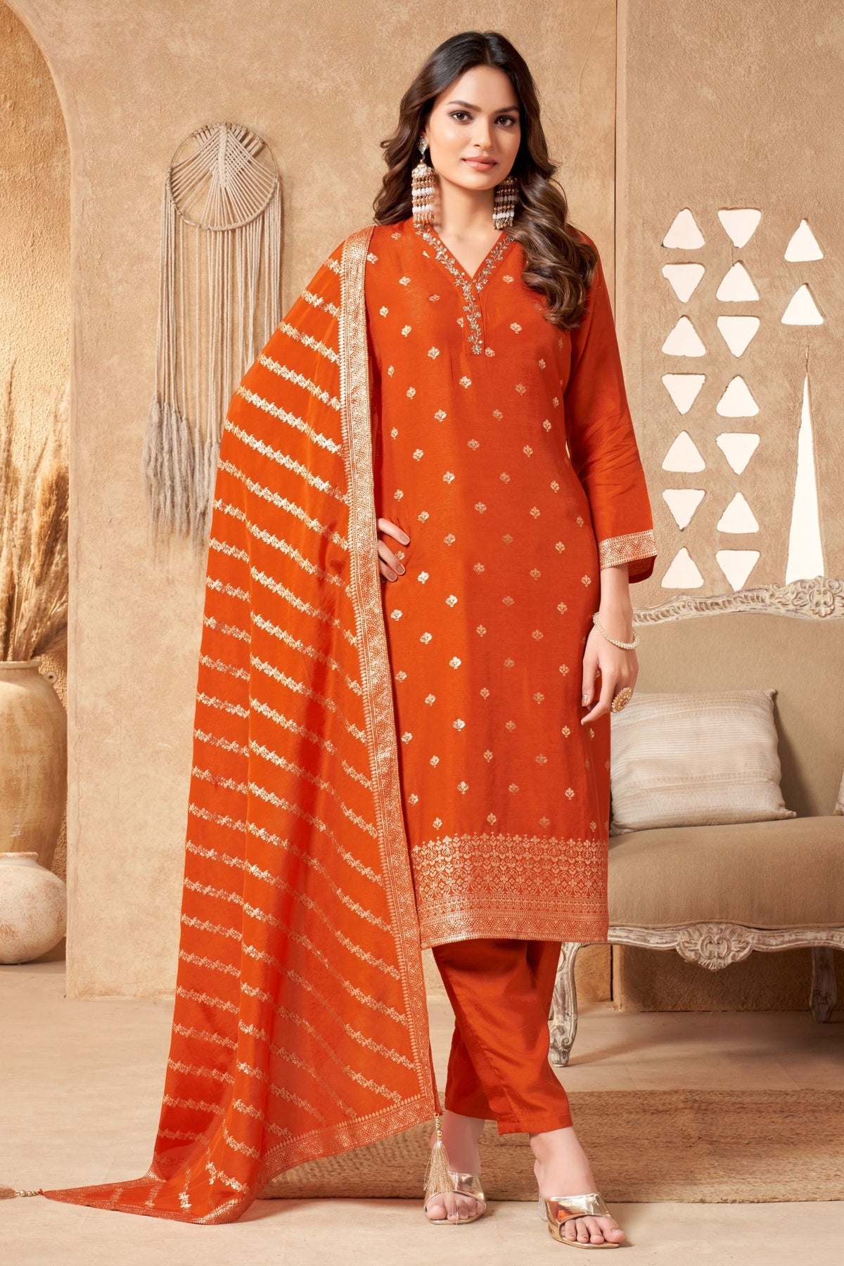 Orange Banaras, Zardozi, Beads and Sequins work Straight Cut Salwar Suit