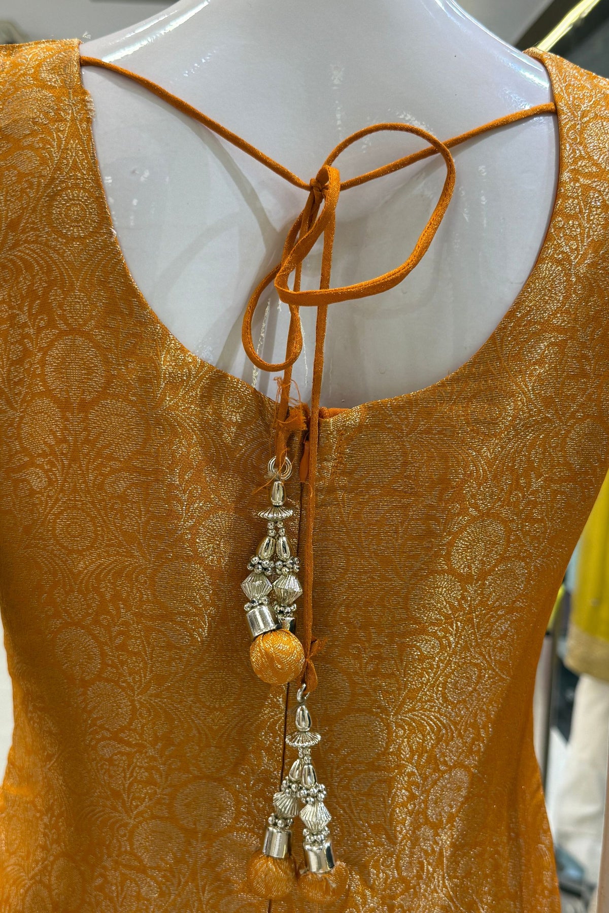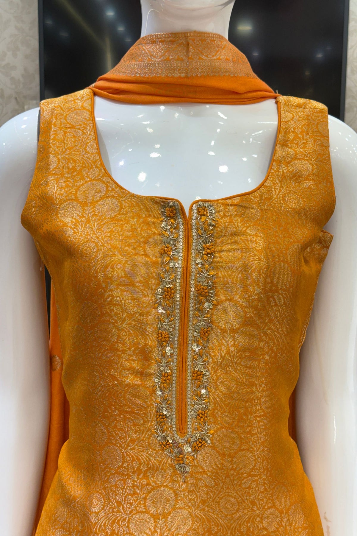 Orange Brocade, Zardozi, Sequins, Stone and Thread work Straight Cut Salwar Suit
