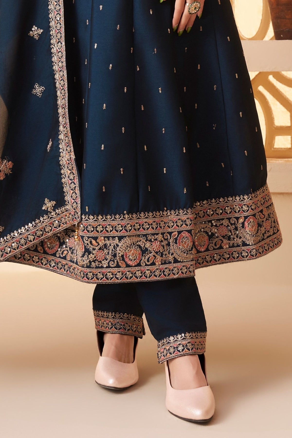 | Features | Sequins, Zari and Multicolor Thread work |