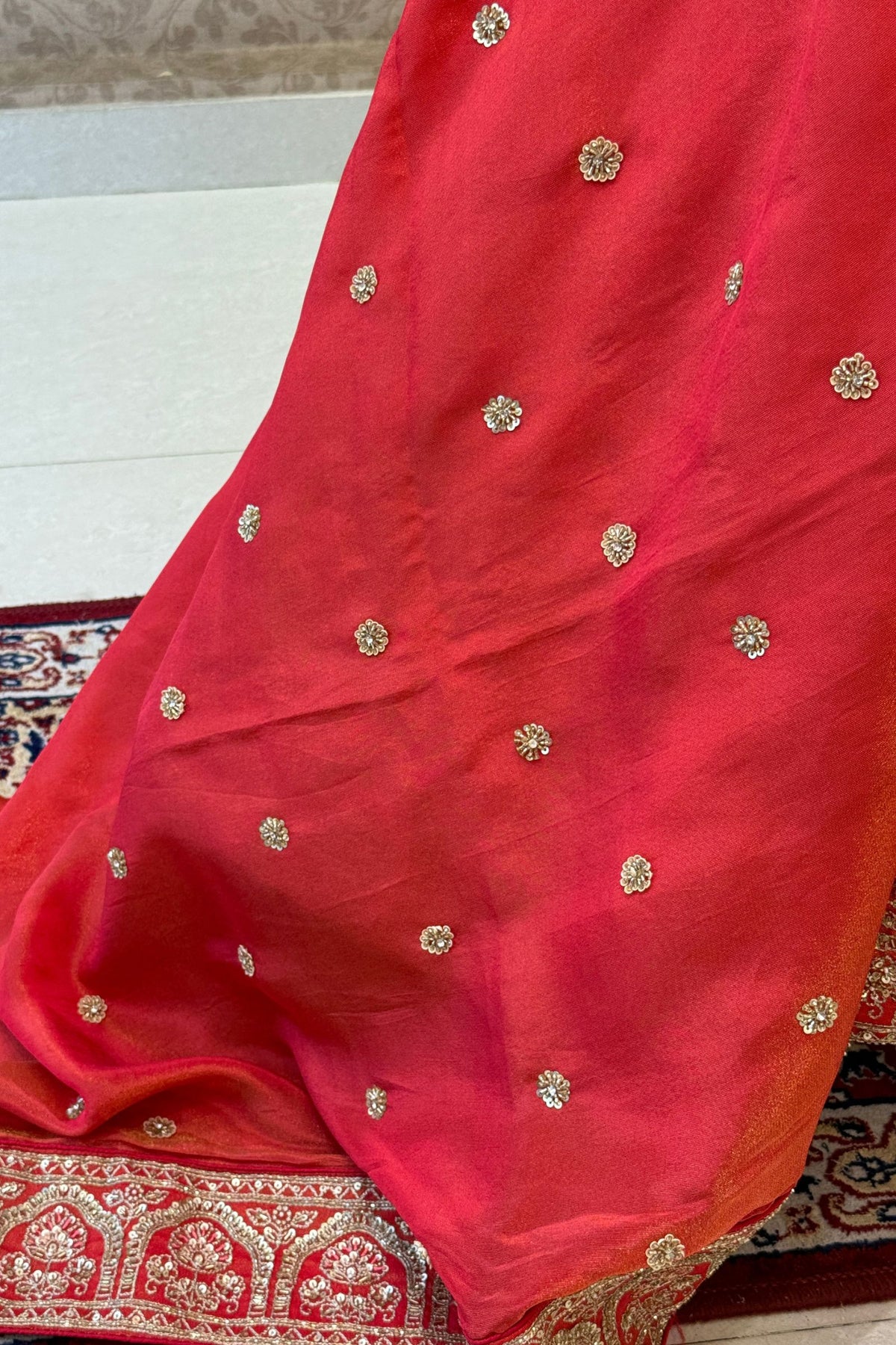 Tomato Red Beads, Zardozi, Sequins and Zari work Crop Top Designer Bridal Lehenga