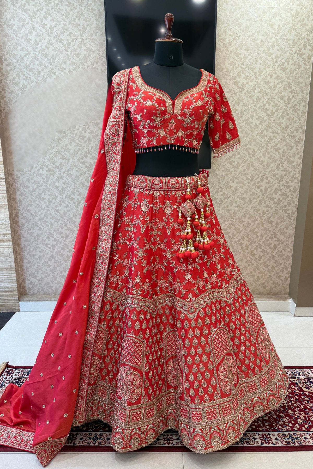 Tomato Red Beads, Zardozi, Thread, Sequins and Zari work Crop Top Designer Bridal Lehenga
