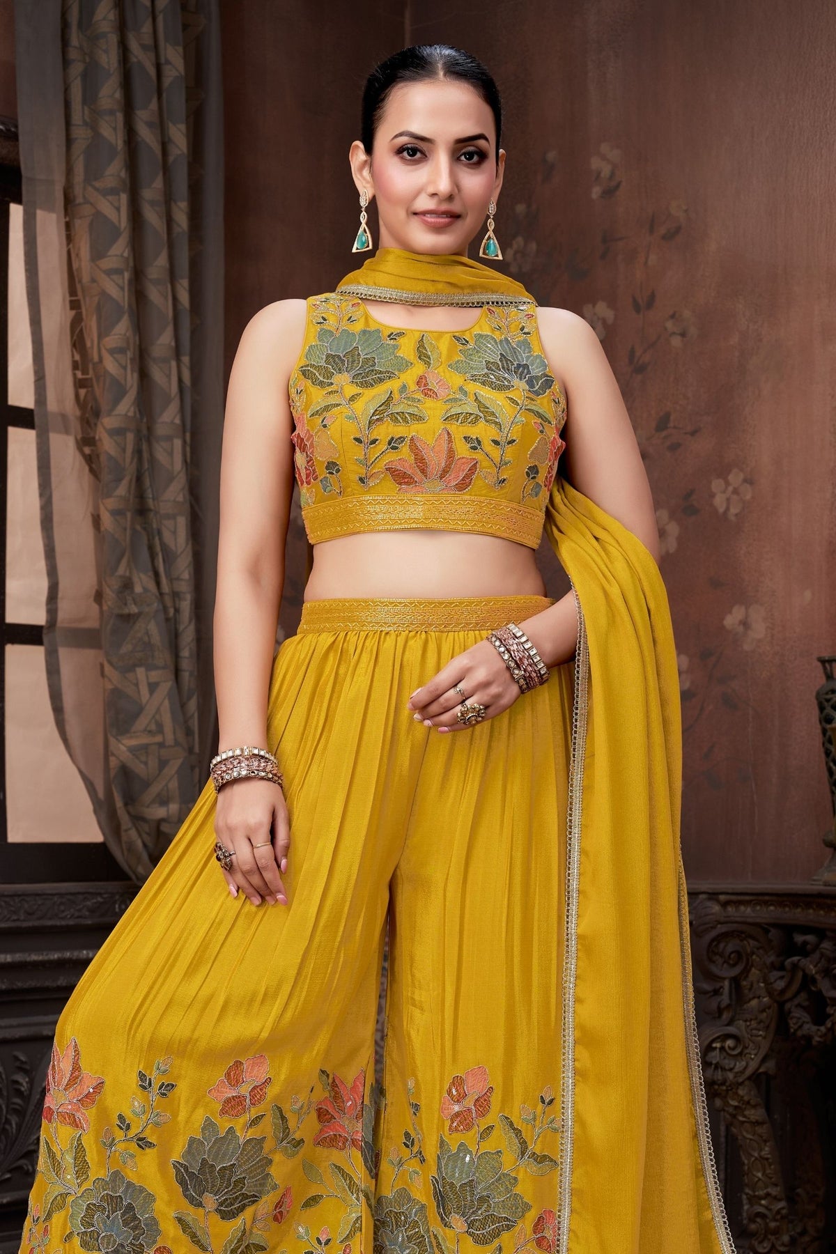 Yellow Multicolor Thread, Beads and Zari work Palazzo Suit Set