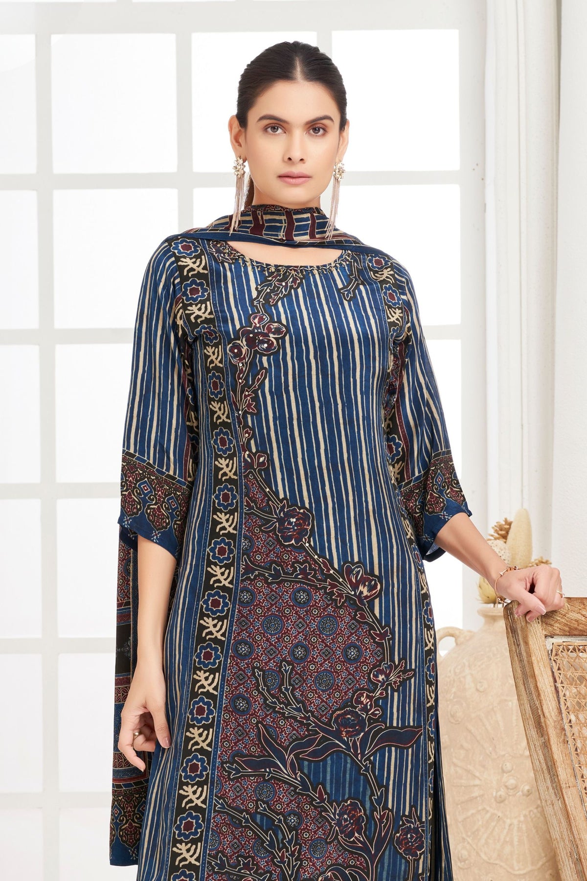 Blue with Ajrakh Print Straight Cut Salwar Suit