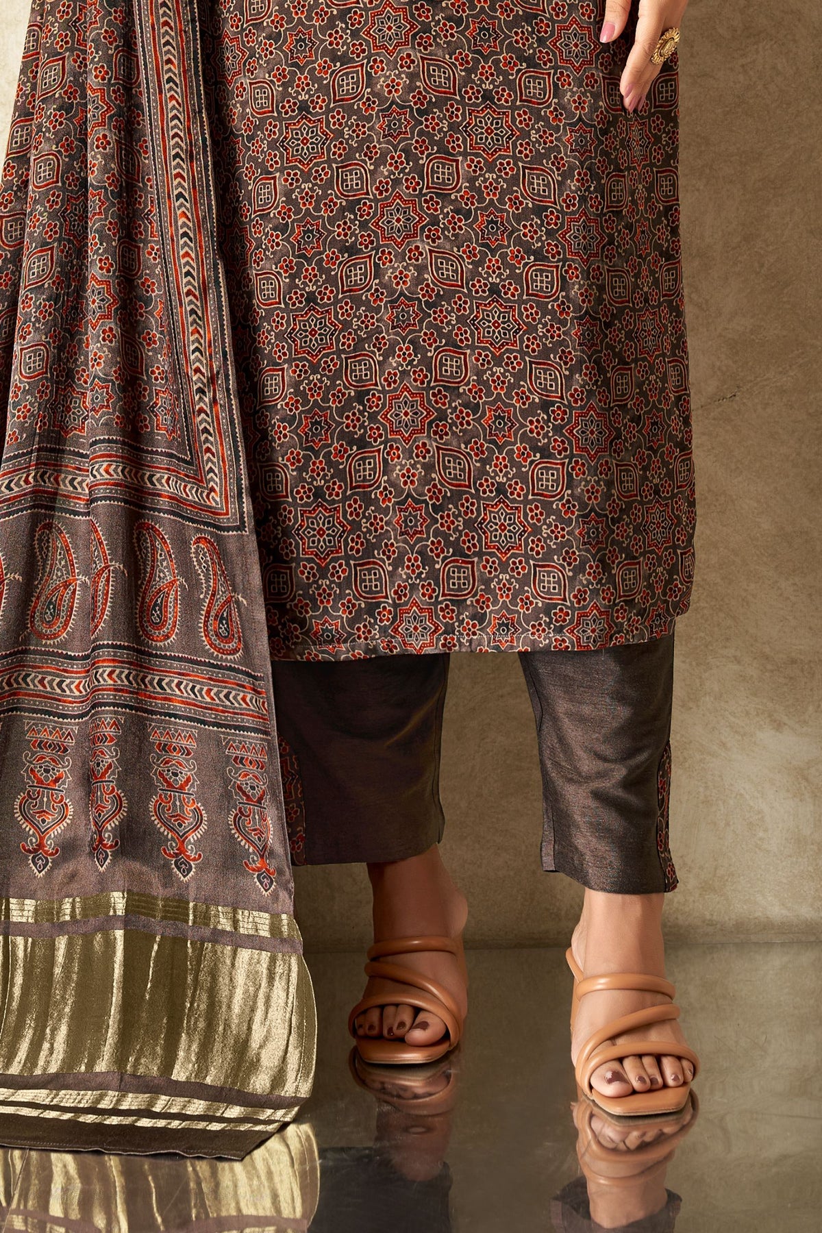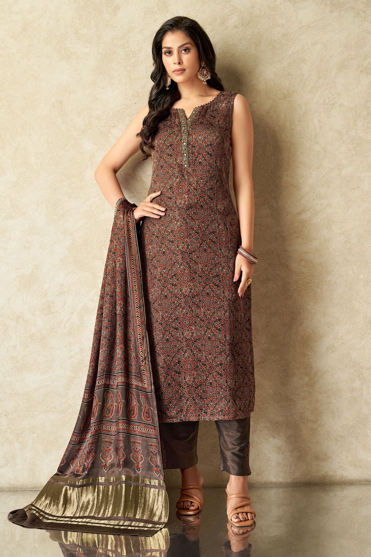 Brown Zardozi, Mirror, Stone and Beads work with Ajrakh Print Straight Cut Salwar Suit
