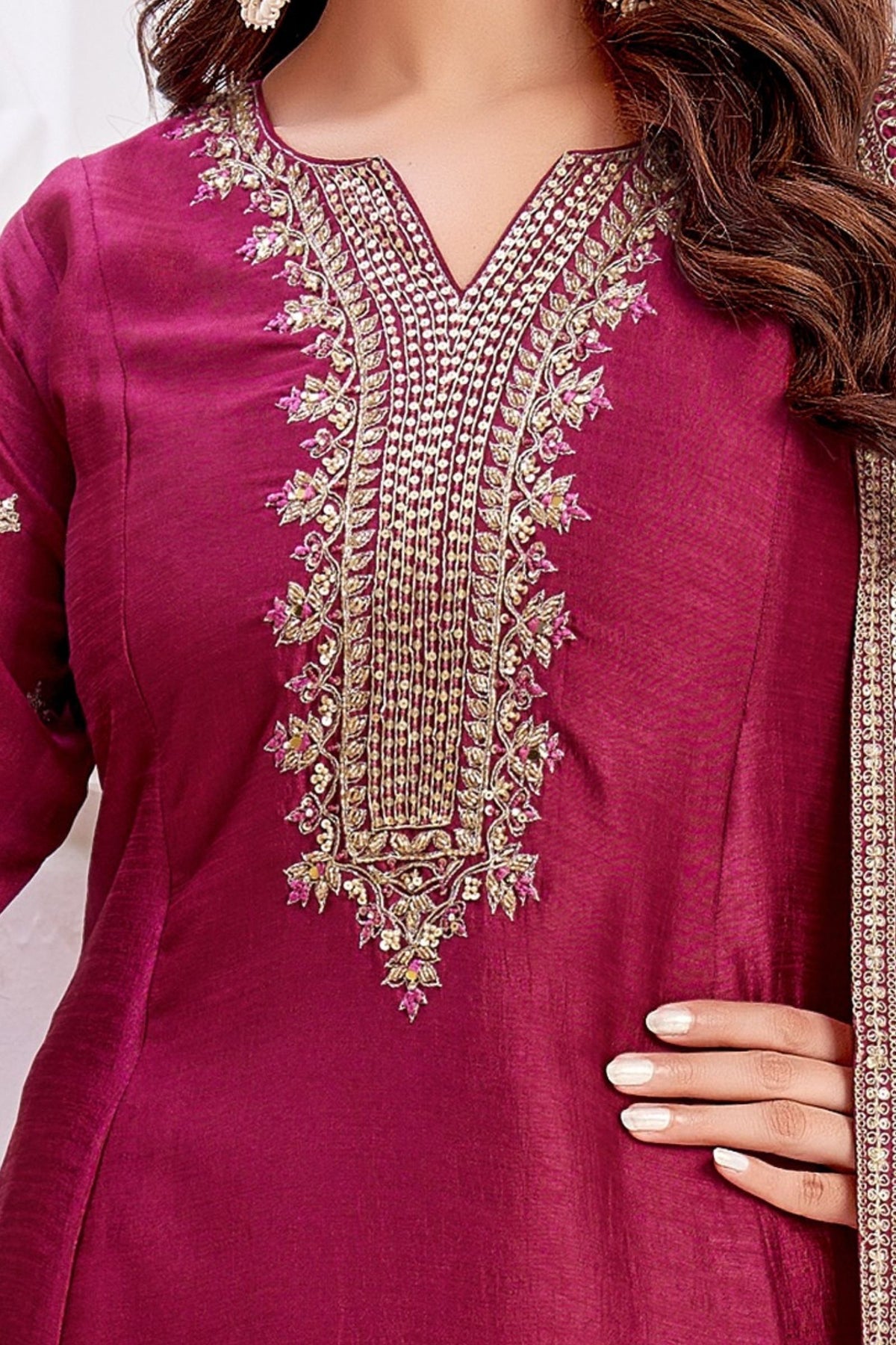 Magenta Beads, Sequins, Mirror, Stone and Thread work A-line Cut Salwar Suit