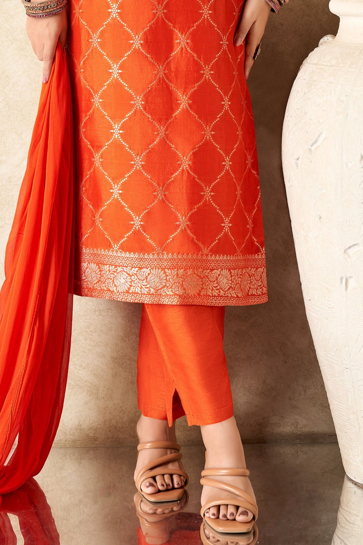 Orange Mirror, Zari, Zardozi and Banaras work Straight Cut Salwar Suit
