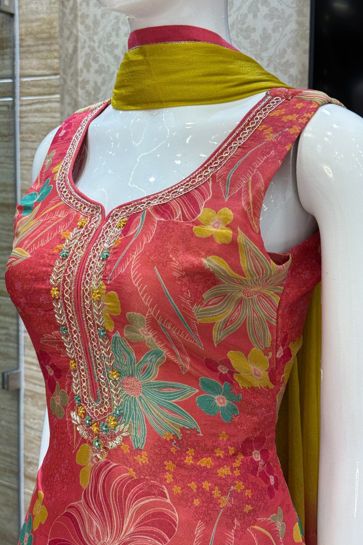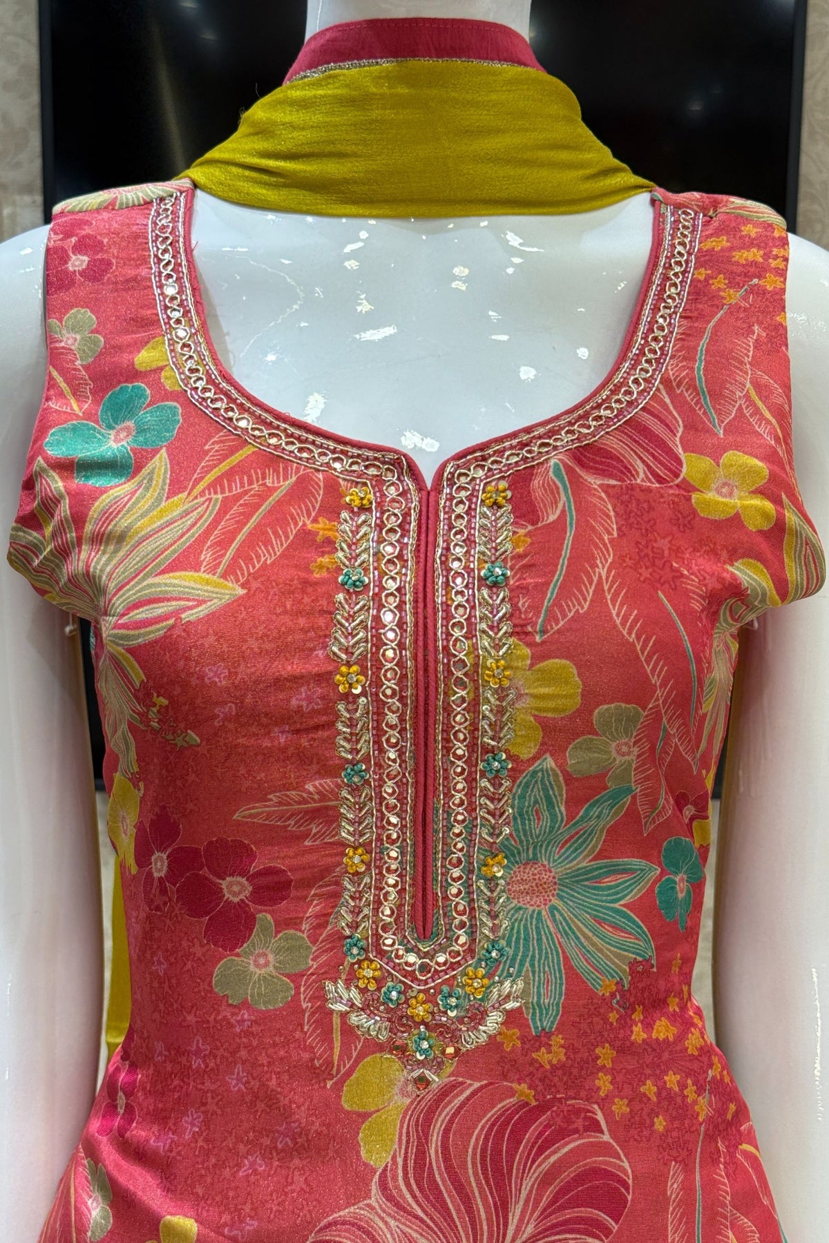 Pinkish Red Zardozi, Beads, Sequins and Stone work with Floral Print Straight Cut Salwar Suit