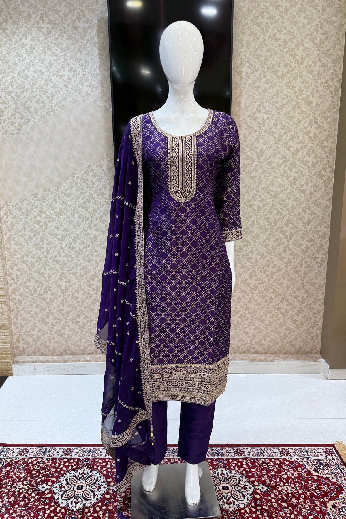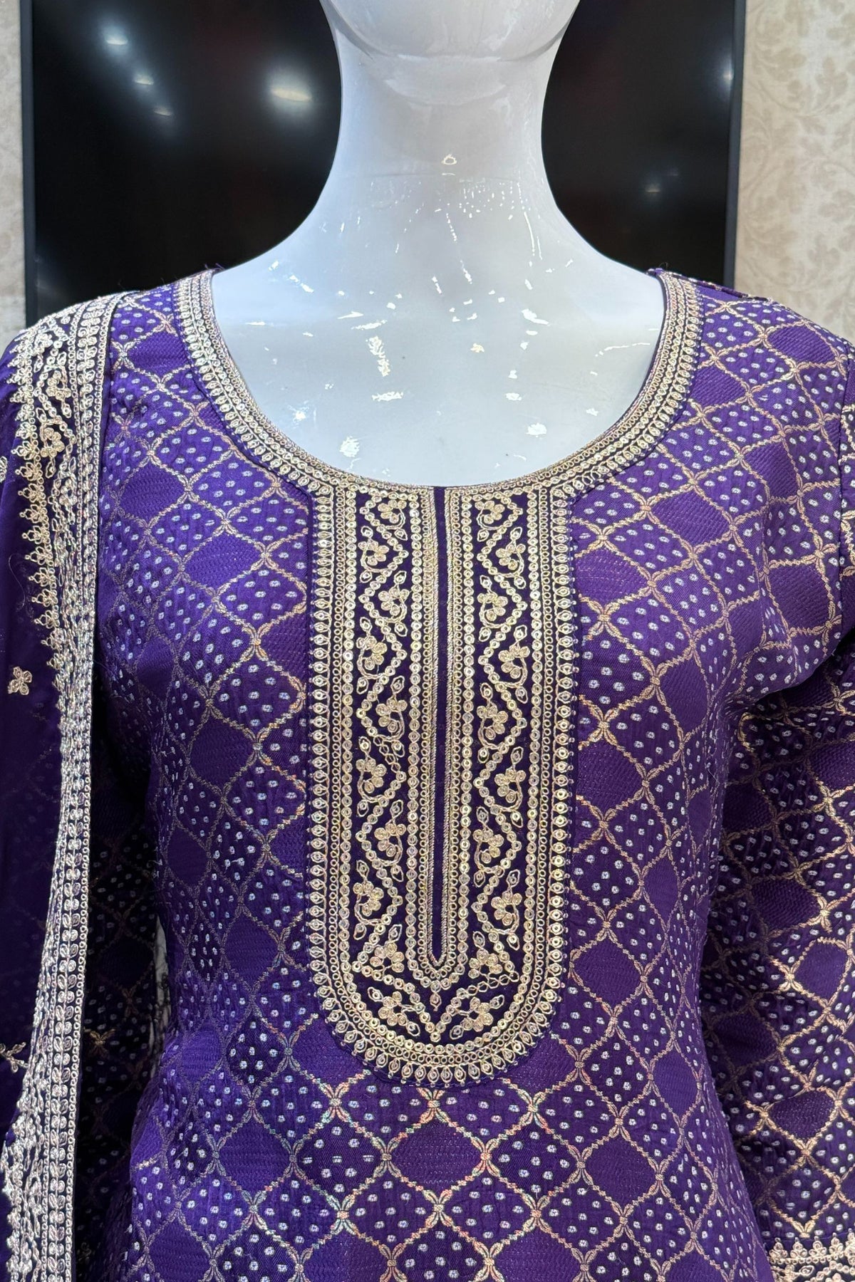Purple Banaras, Sequins and Zari work with Bandini Print Straight Cut Salwar Suit