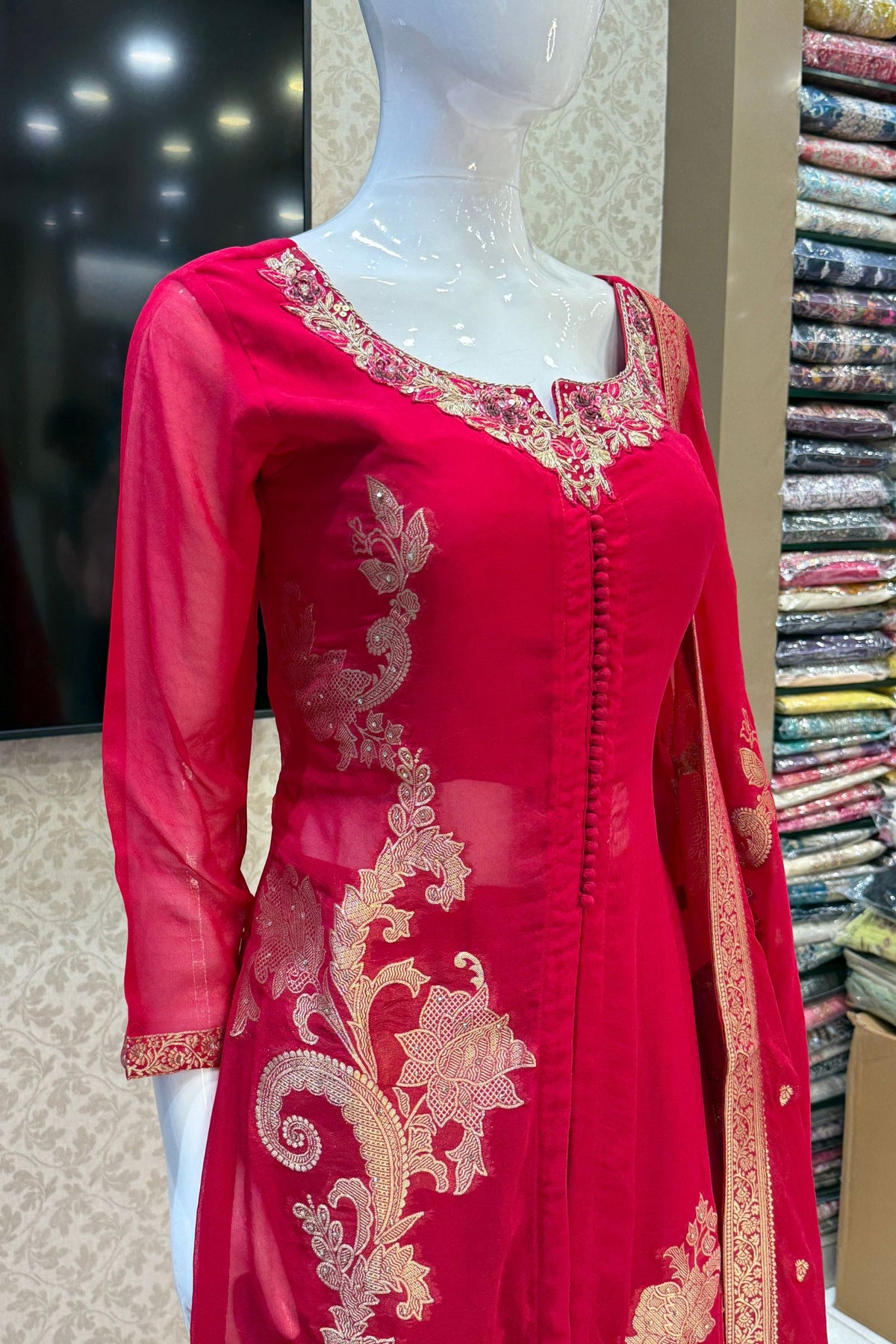 Rani Pink Banaras, Stone, Zardozi, SEquins, Beads and Zari work Straight Cut Salwar Suit