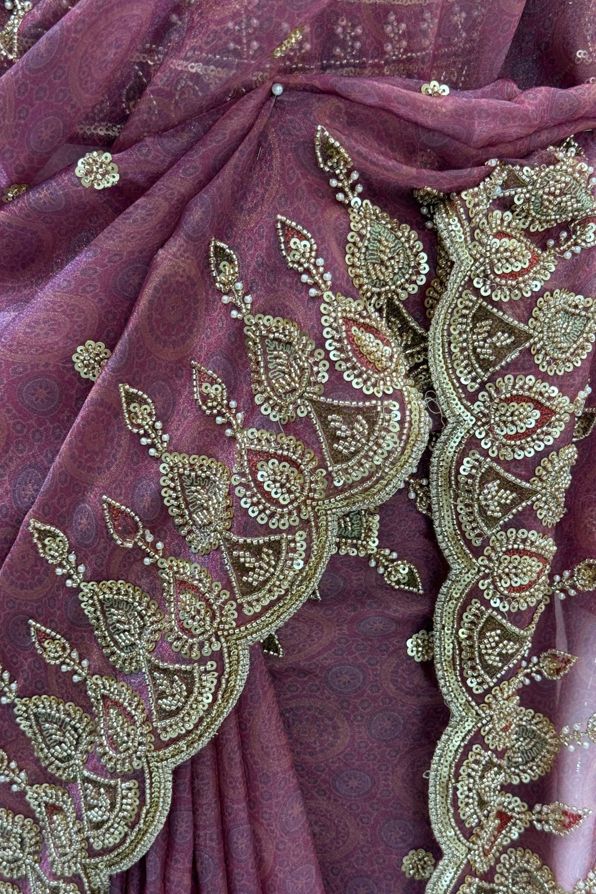 Onion Pink Pearls, Beads and Multicolor Thread work with Self Print Saree