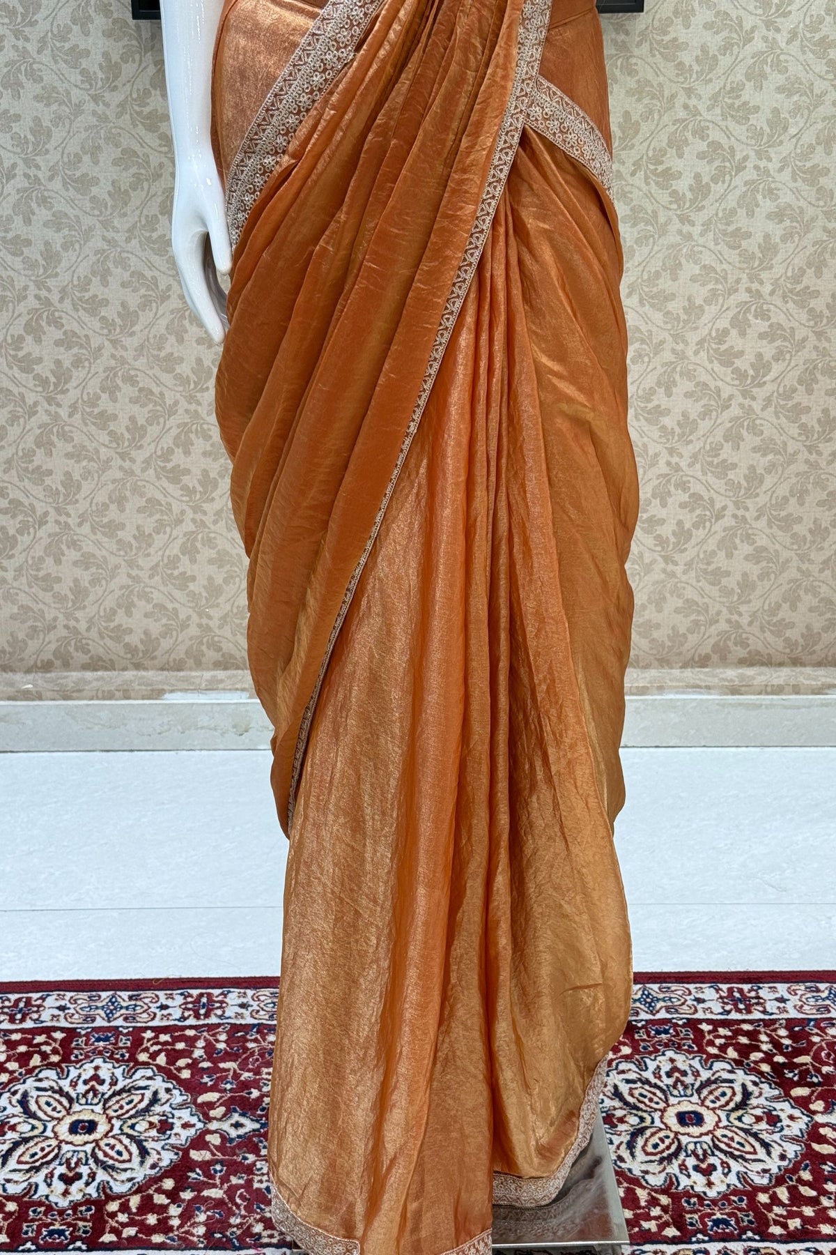 Orange Readymade Saree with Pearl, Zari Thread, Mirror and Stone work Readymade Blouse