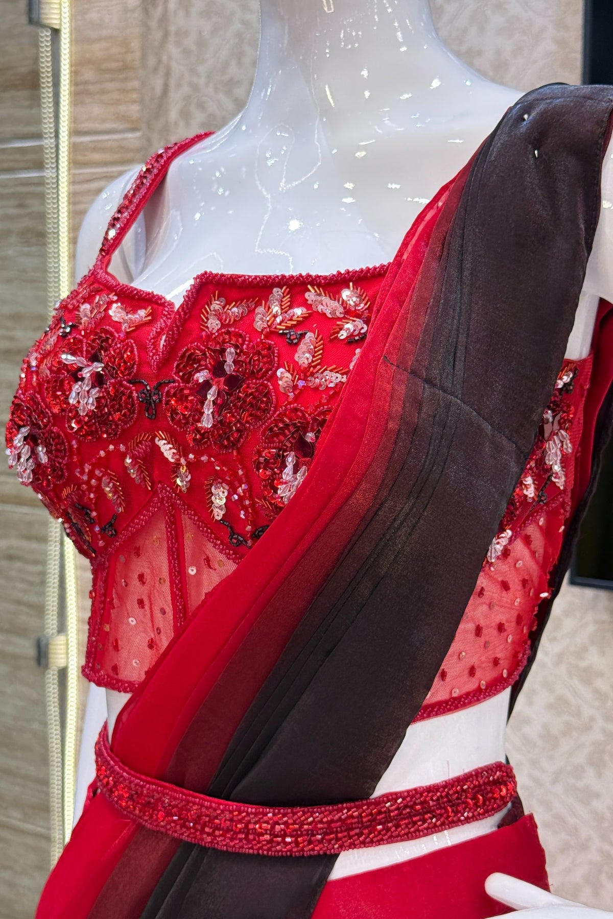 Red with Black Readymade Saree with Beads and Sequins work Readymade Blouse