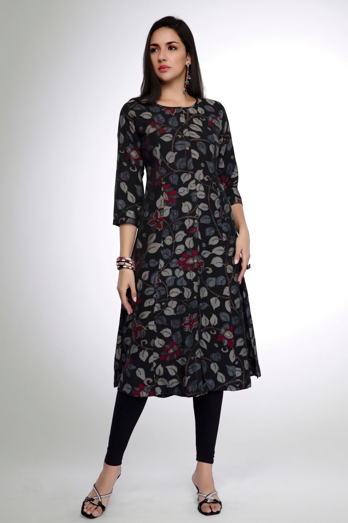 Black with Multicolor Digital Print A-line Cut Calf Length Kurti