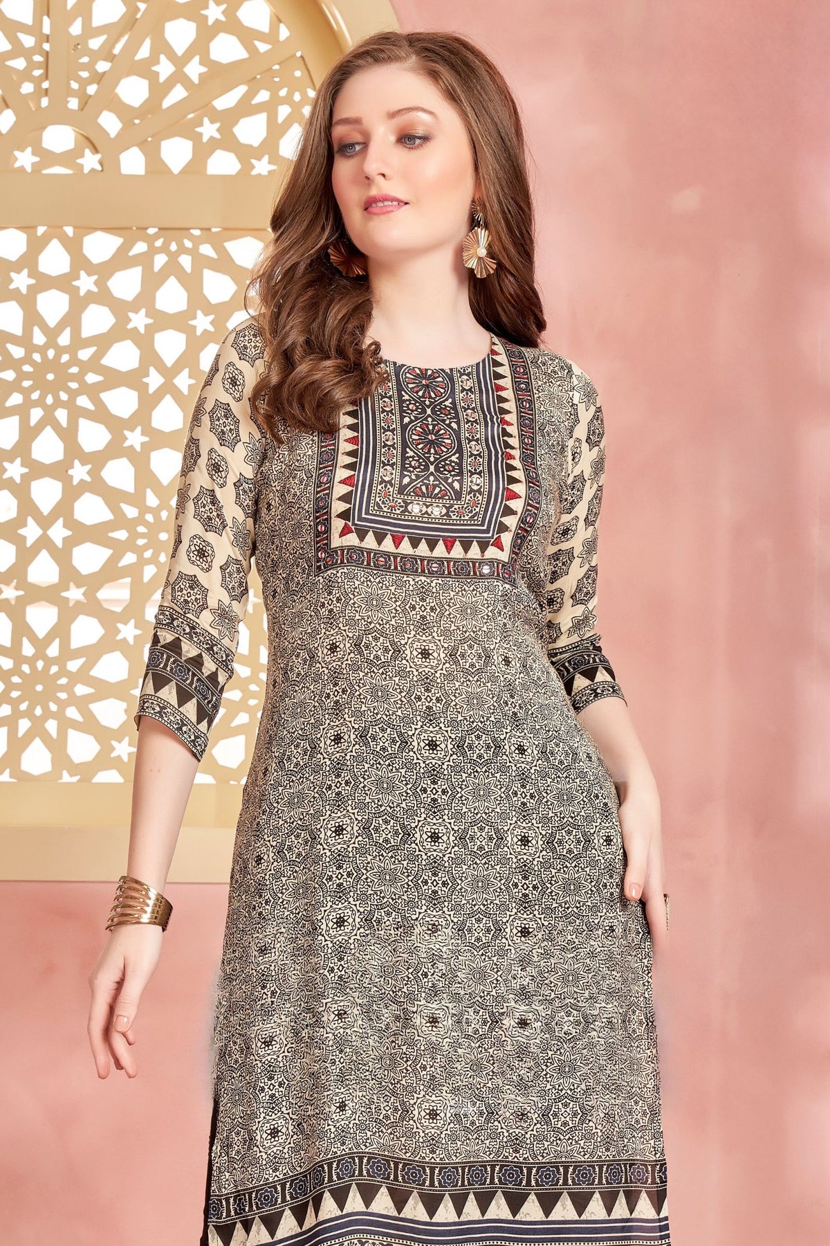 Cream Beads and Thread work with Ajrakh Print Calf Length Kurti