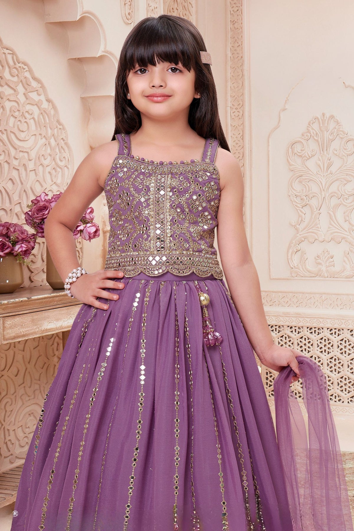 Lilac Sequins, Zari and Stone work Lehenga Choli for Girls