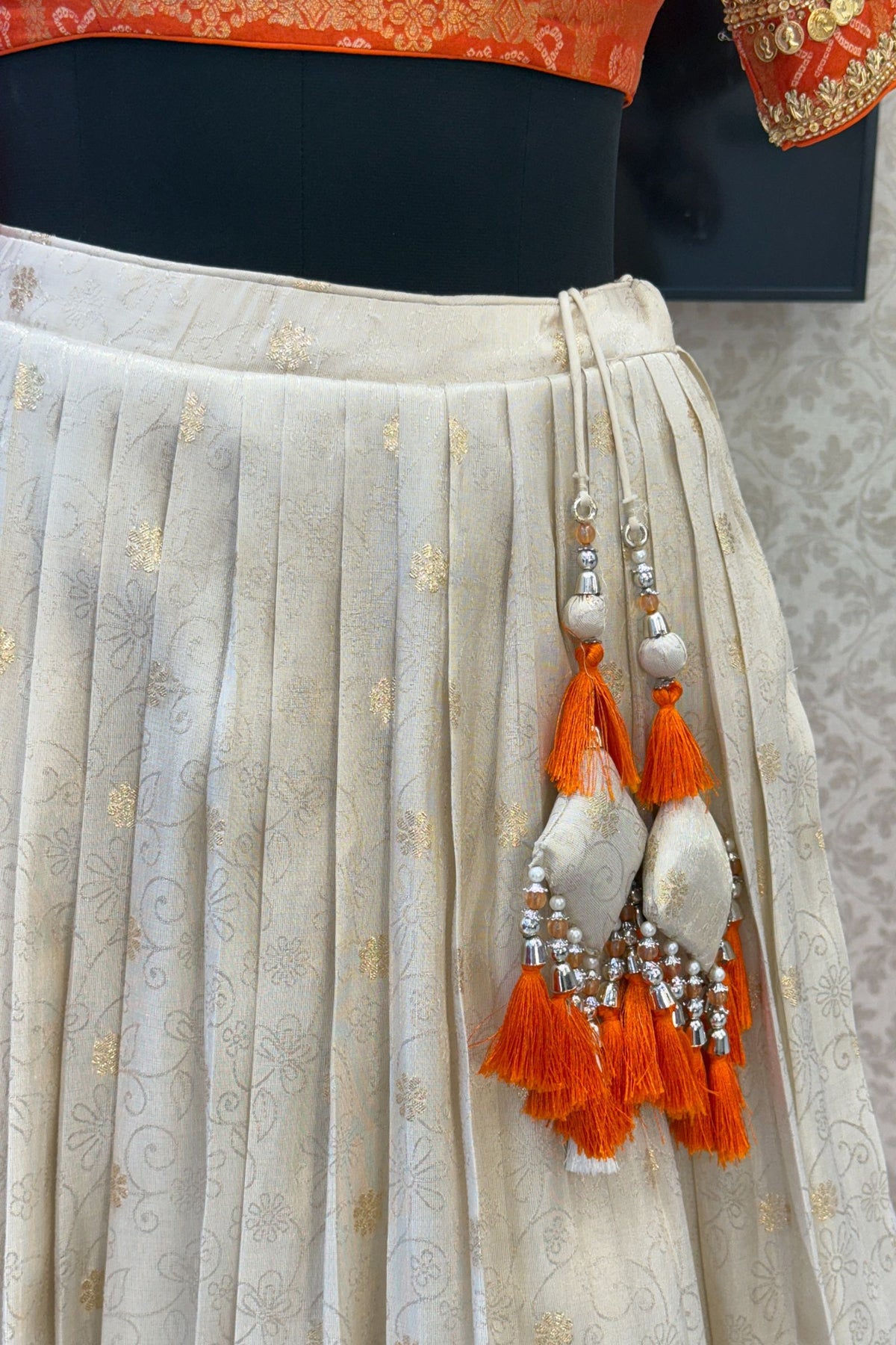 Orange with Cream Banaras, Zardozi, Sequins, Beads and Zari work Crop Top Lehenga